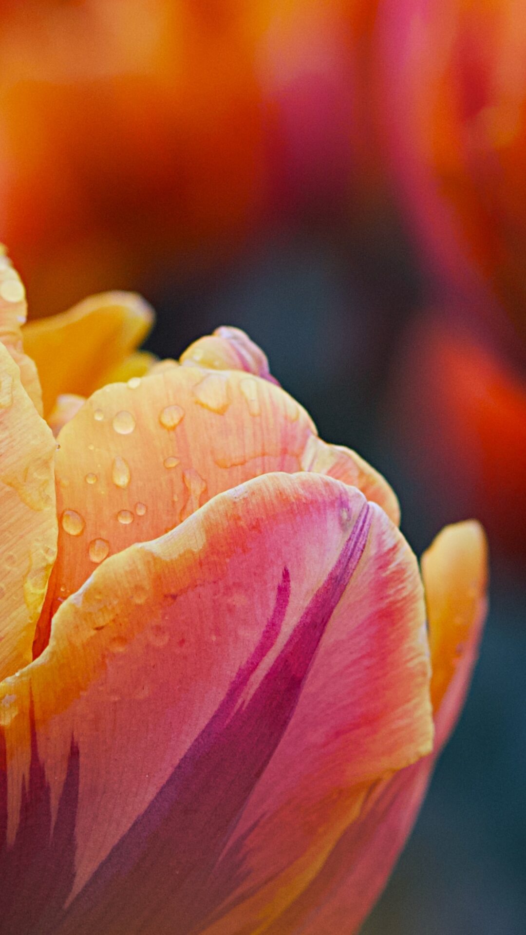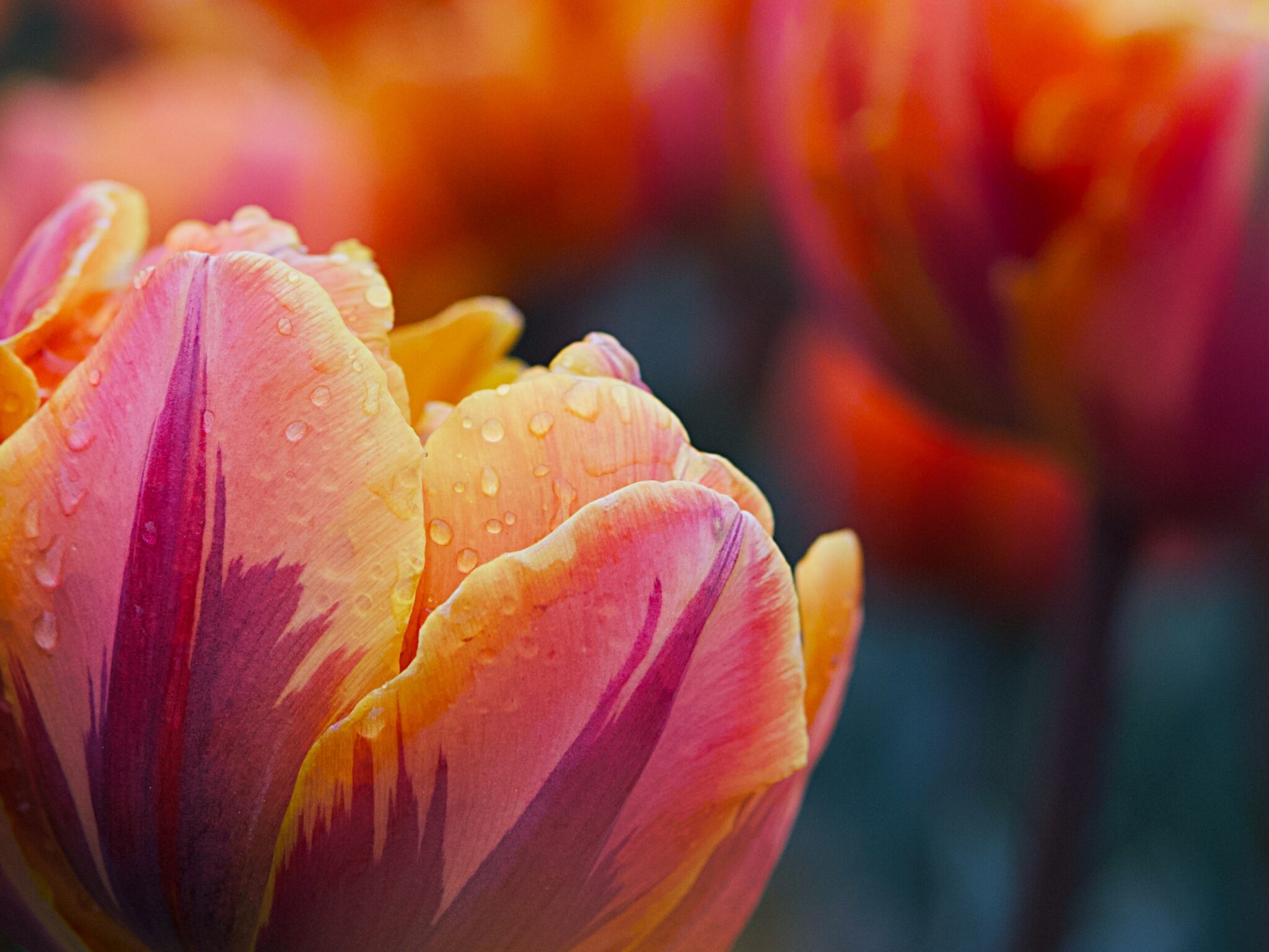 Close-up of tulip blooms in shades of orange and pink fill the frame. Small water droplets cling to the petals, catching the soft light and