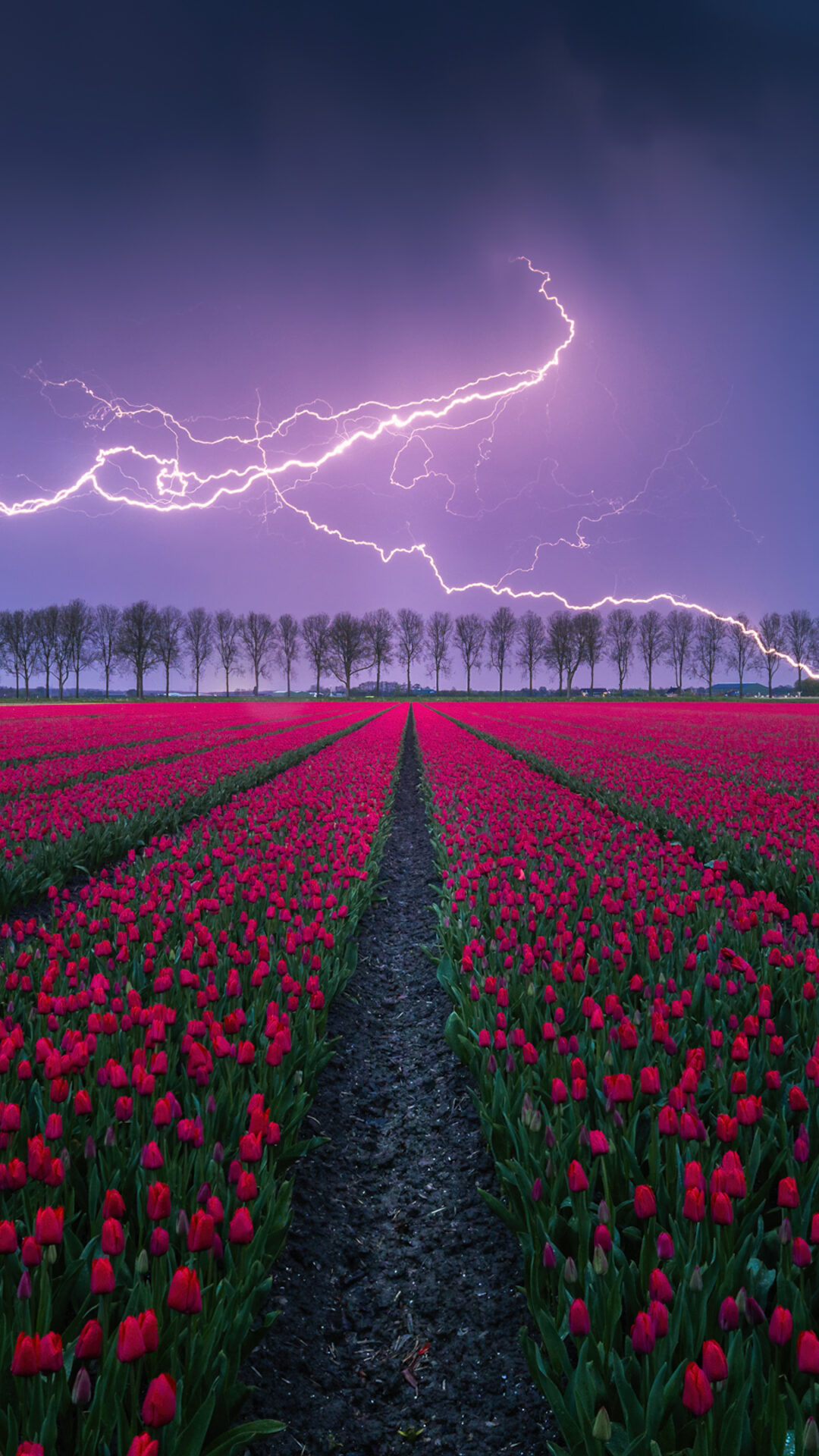 Rows of red tulips stretch toward distant trees under a dramatic, stormy sky. The bright white lightning forks across the dark blue and purp…