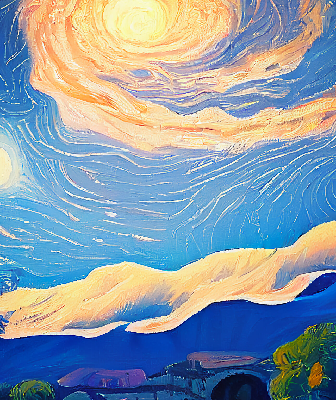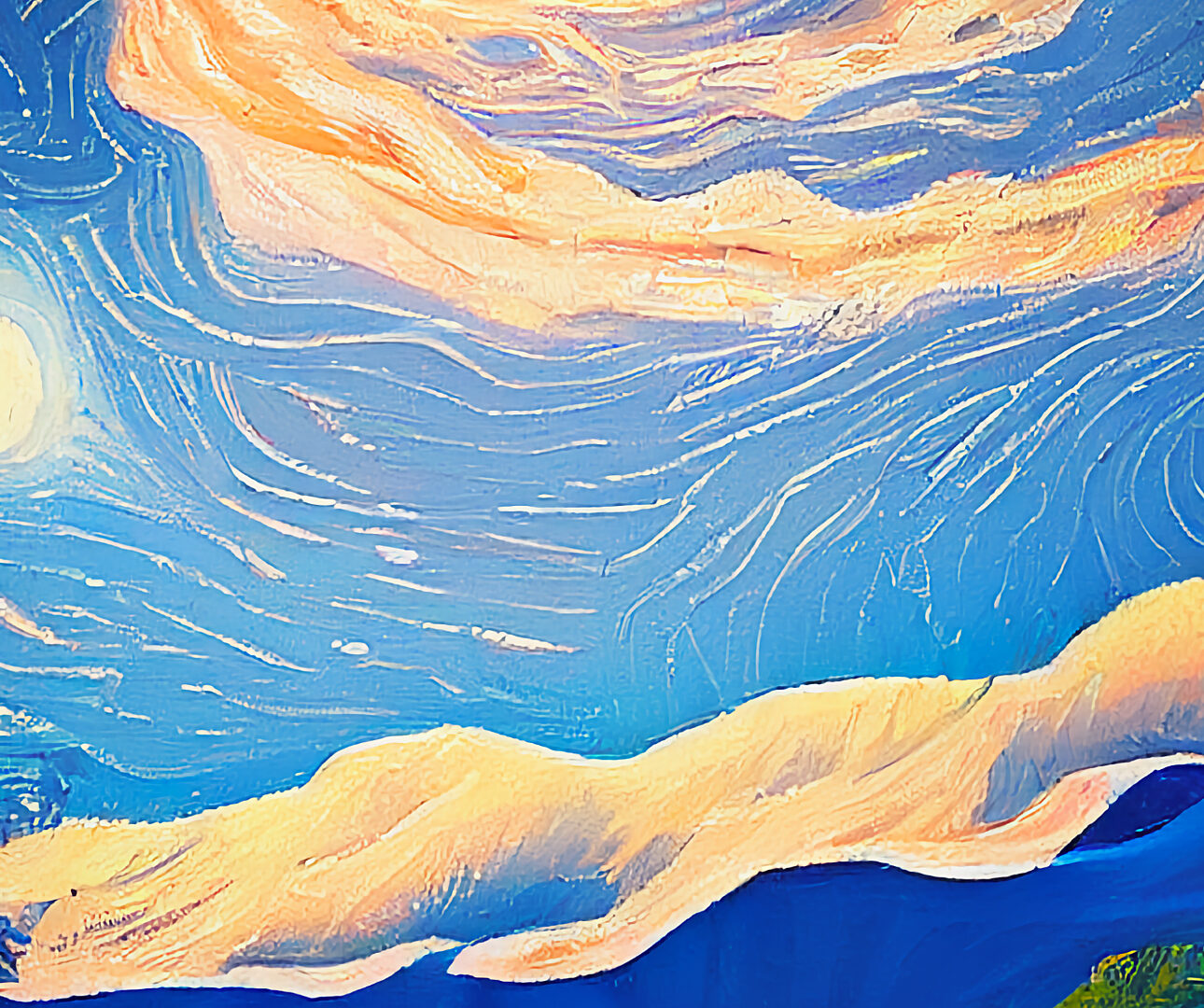 A painted landscape depicts rolling hills and a brightly lit, turbulent sky. Thick brushstrokes and warm orange tones create movement and texture throughout the composition.