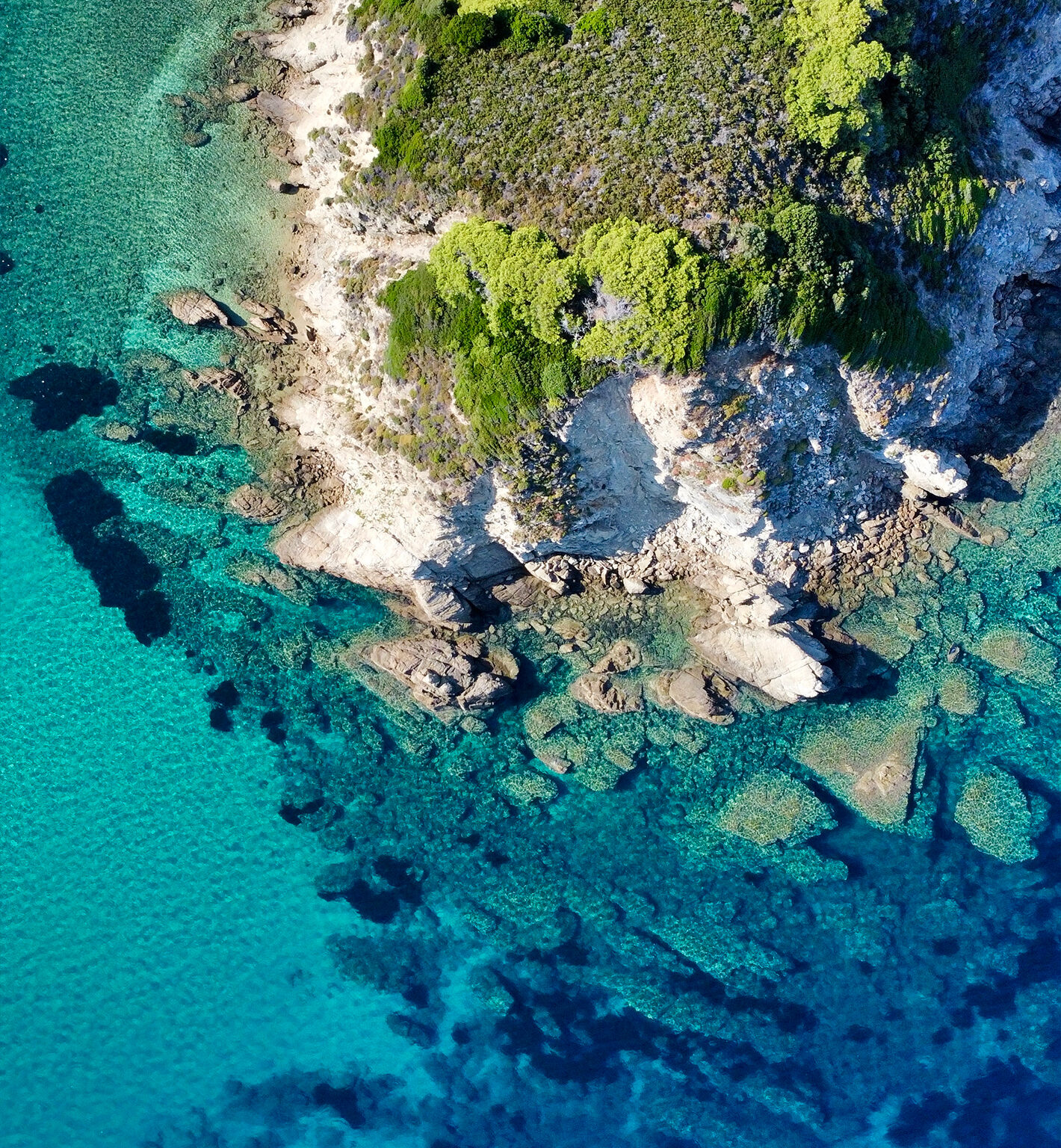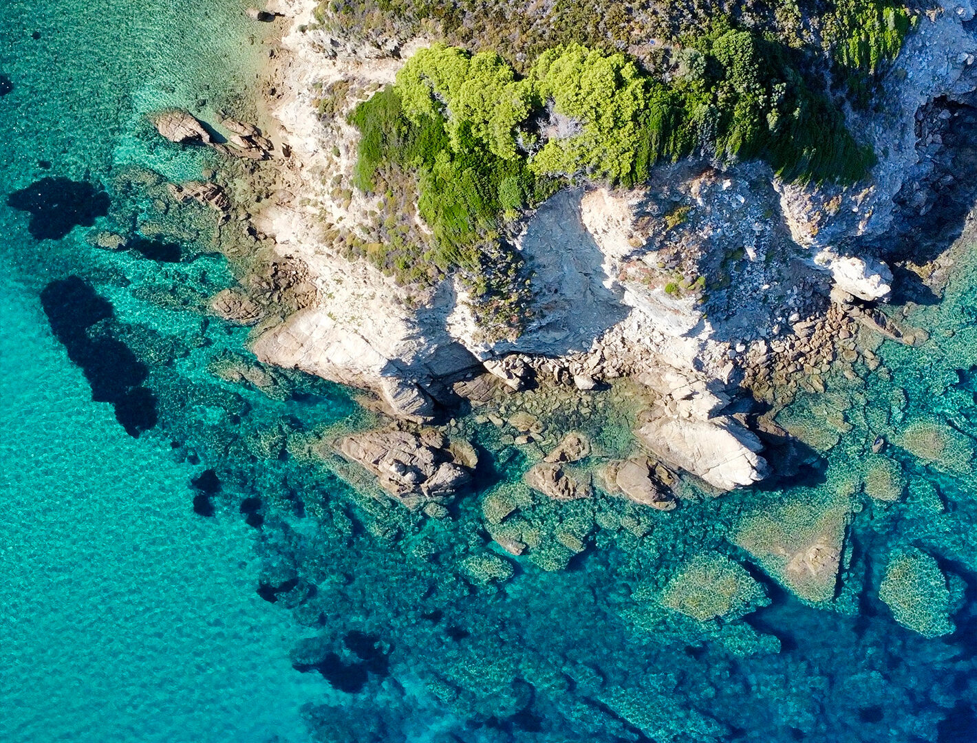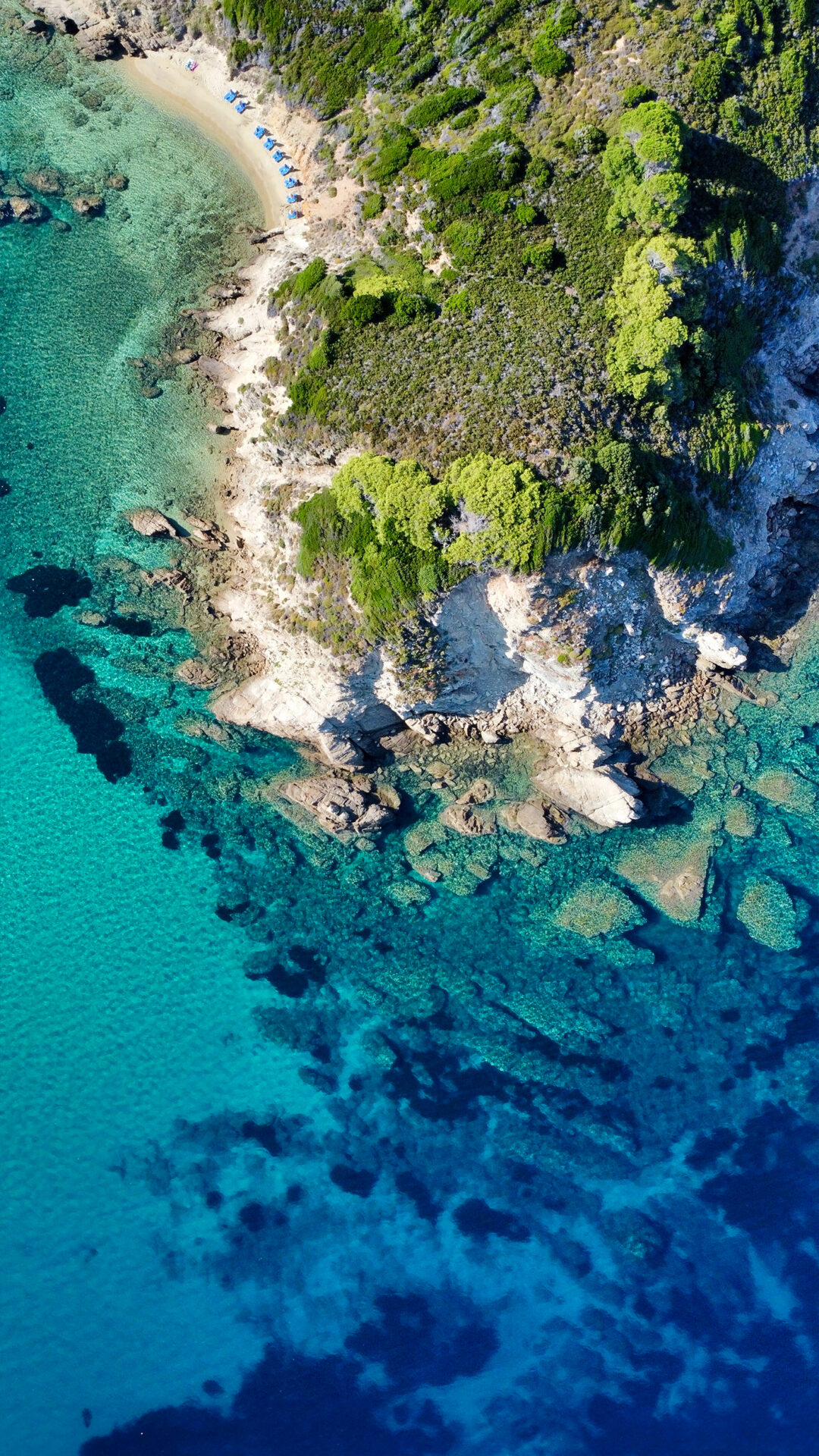 An aerial view reveals a small beach nestled into a rocky coastline, and clear turquoise water. Sunlight creates distinct color variations a