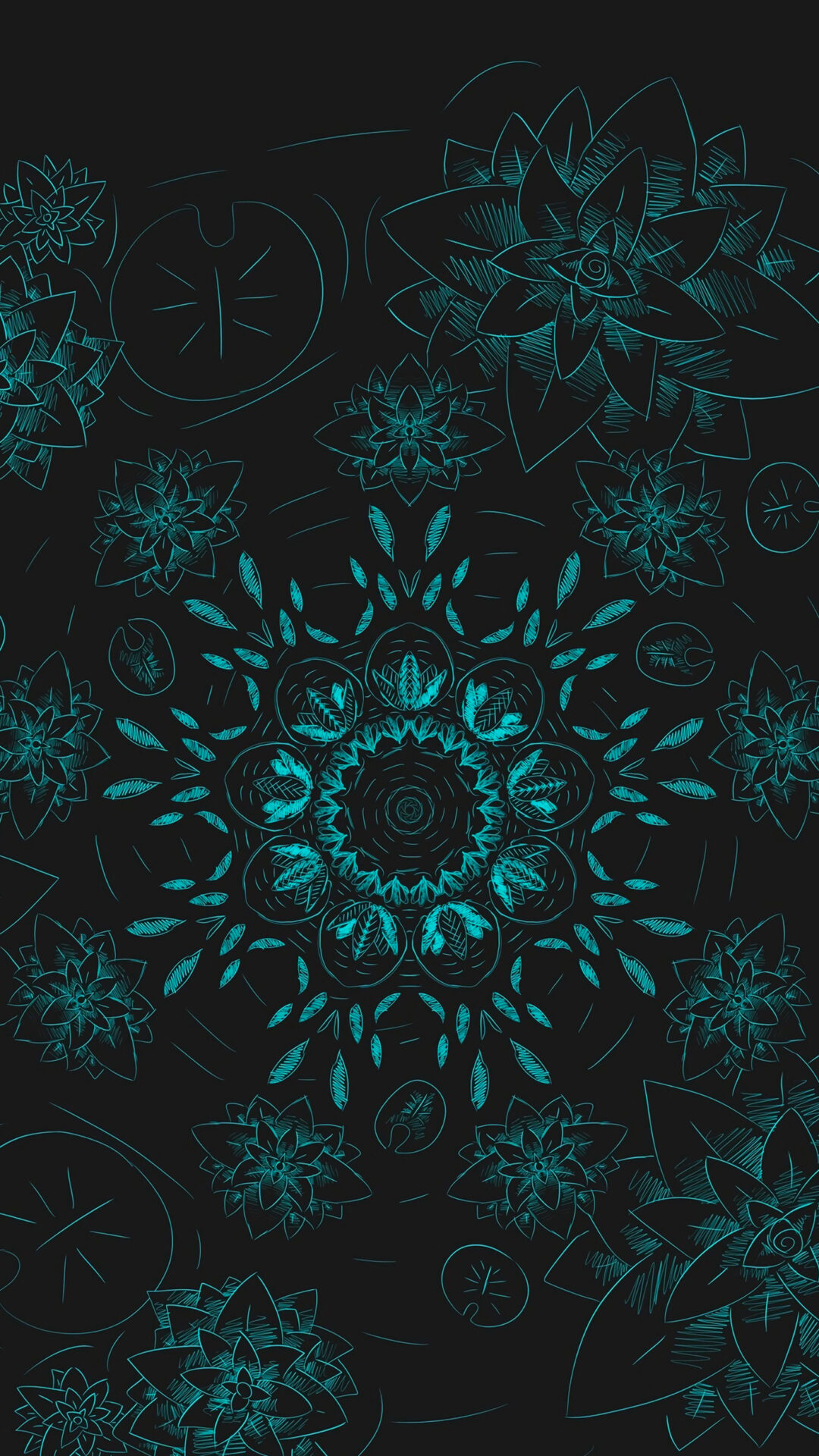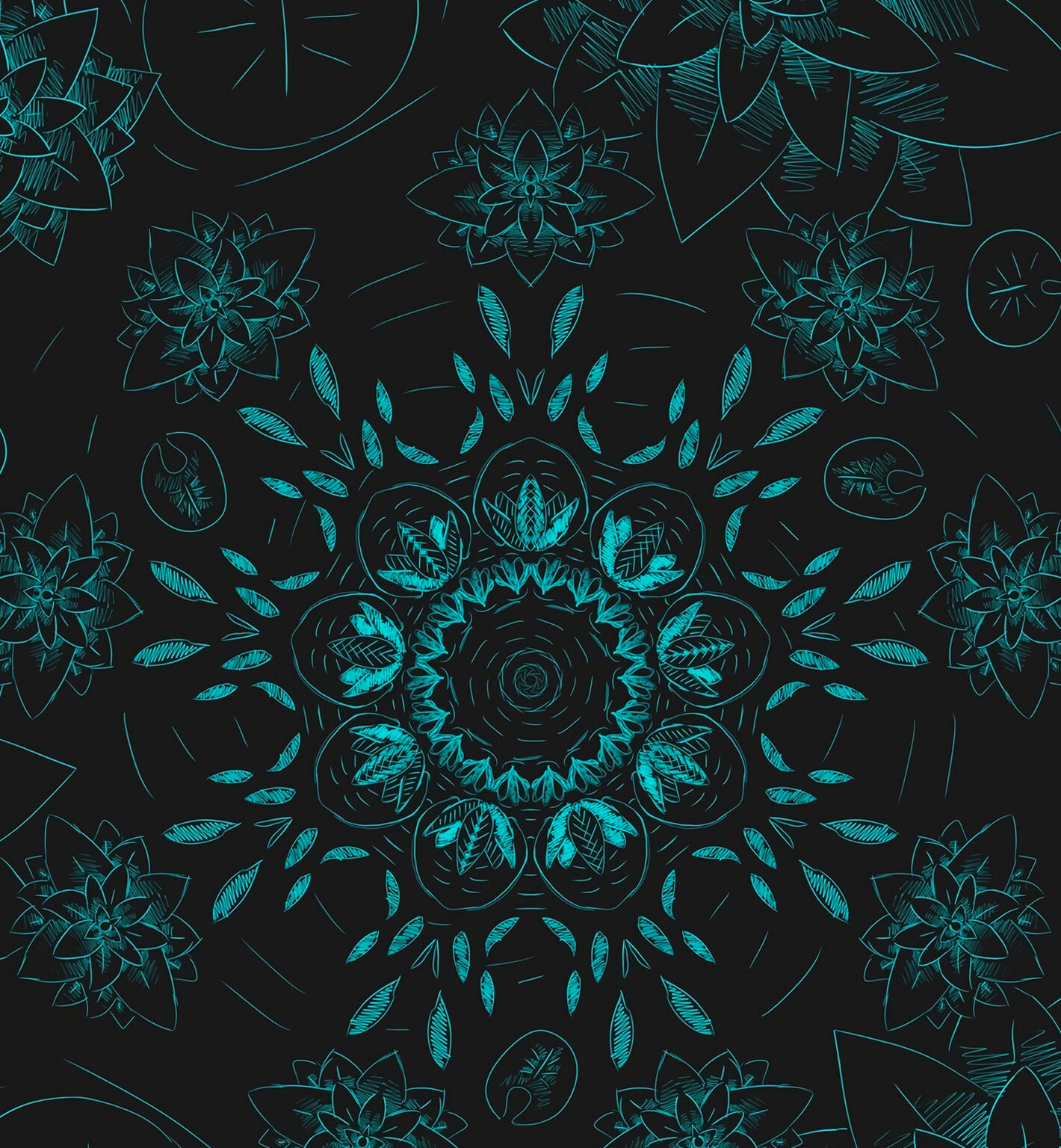 Turquoise floral designs fill a dark, matte background with a vertical composition. Fine, intricate lines define each bloom and its surround…