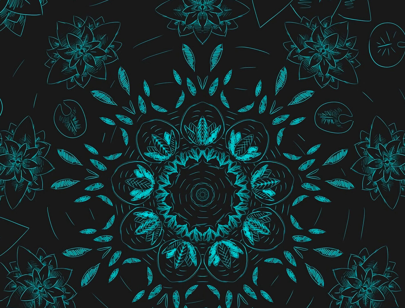 Turquoise floral designs fill a dark, matte background with a vertical composition. Fine, intricate lines define each bloom and its surrounding shapes, creating a textured depth.