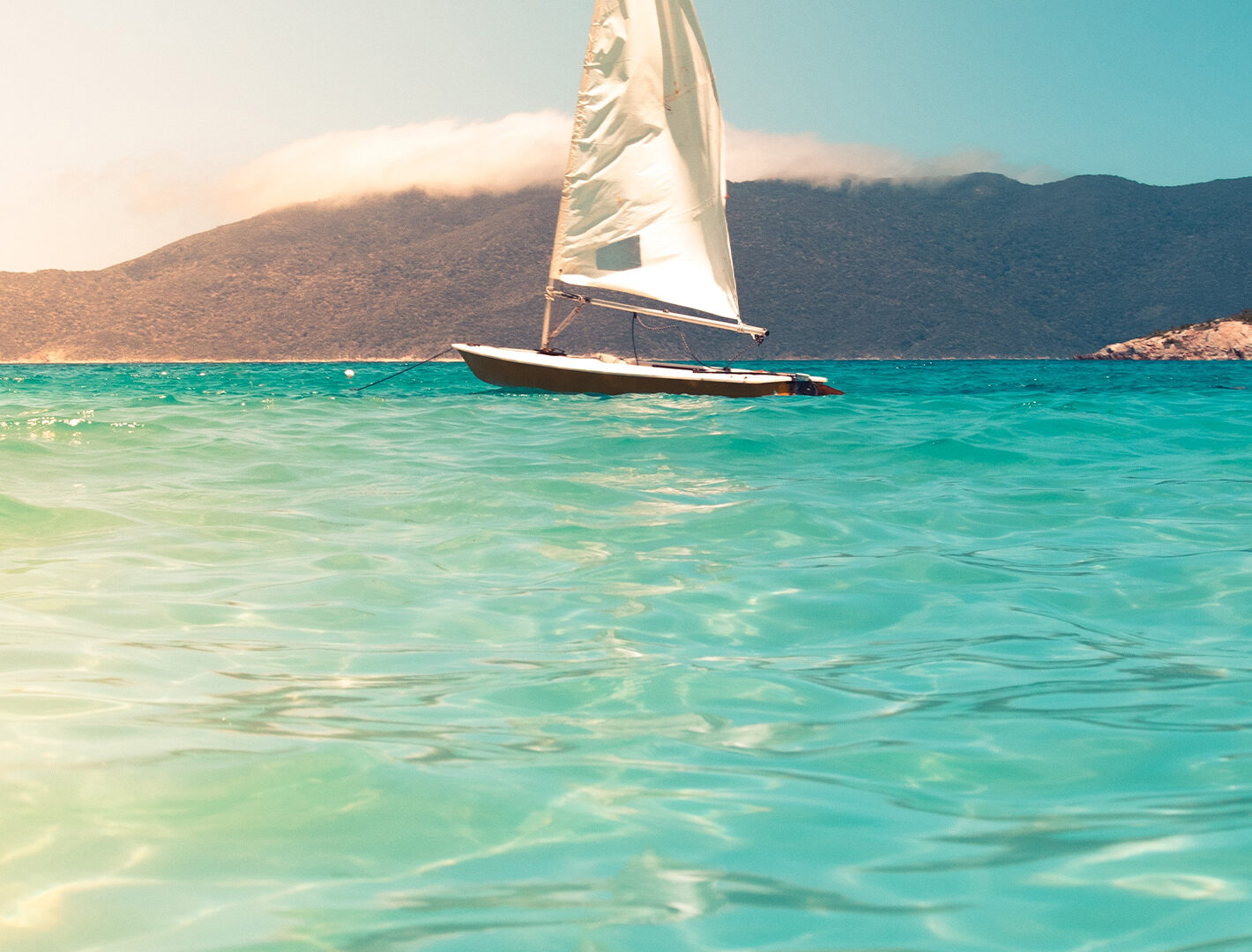 A white sailboat is positioned on clear turquoise water, facing a distant landmass. Sunlight creates rippling patterns and reflections acros