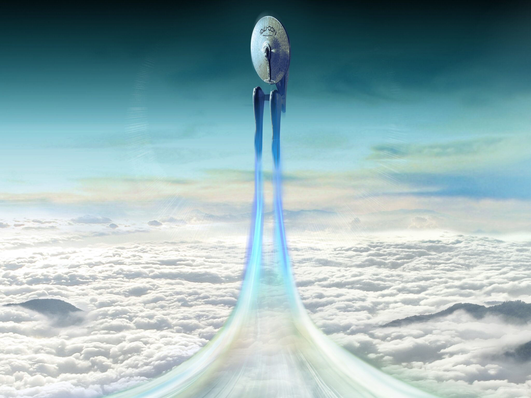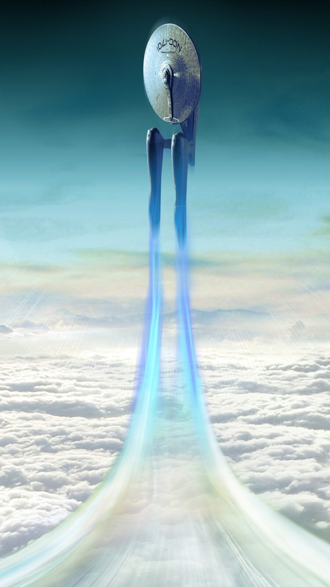 The iconic USS Enterprise soars above a sea of white clouds with brilliant blue engine trails streaming behind against the deep teal sky. Th…