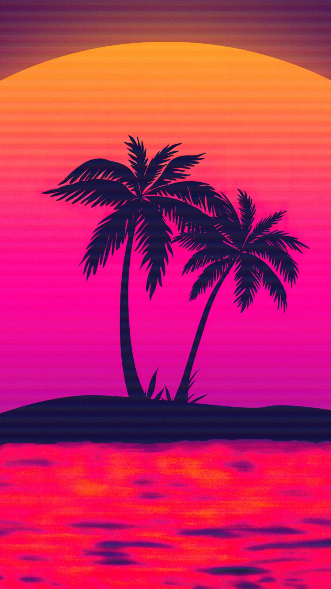 Two silhouetted palm trees stand on a small island against a massive pink and orange gradient sun, with purple skies and magenta water creat…