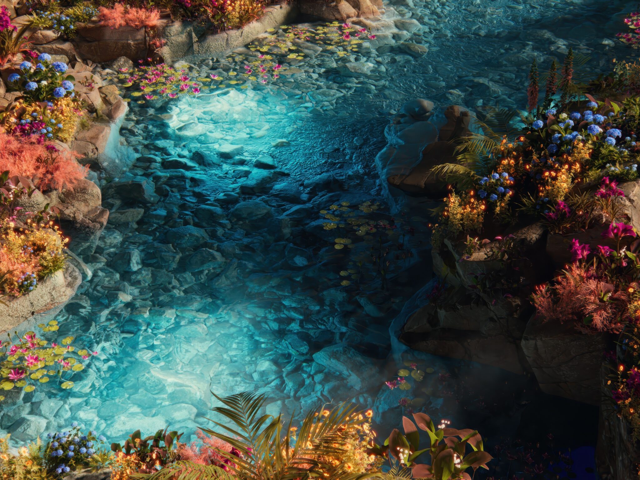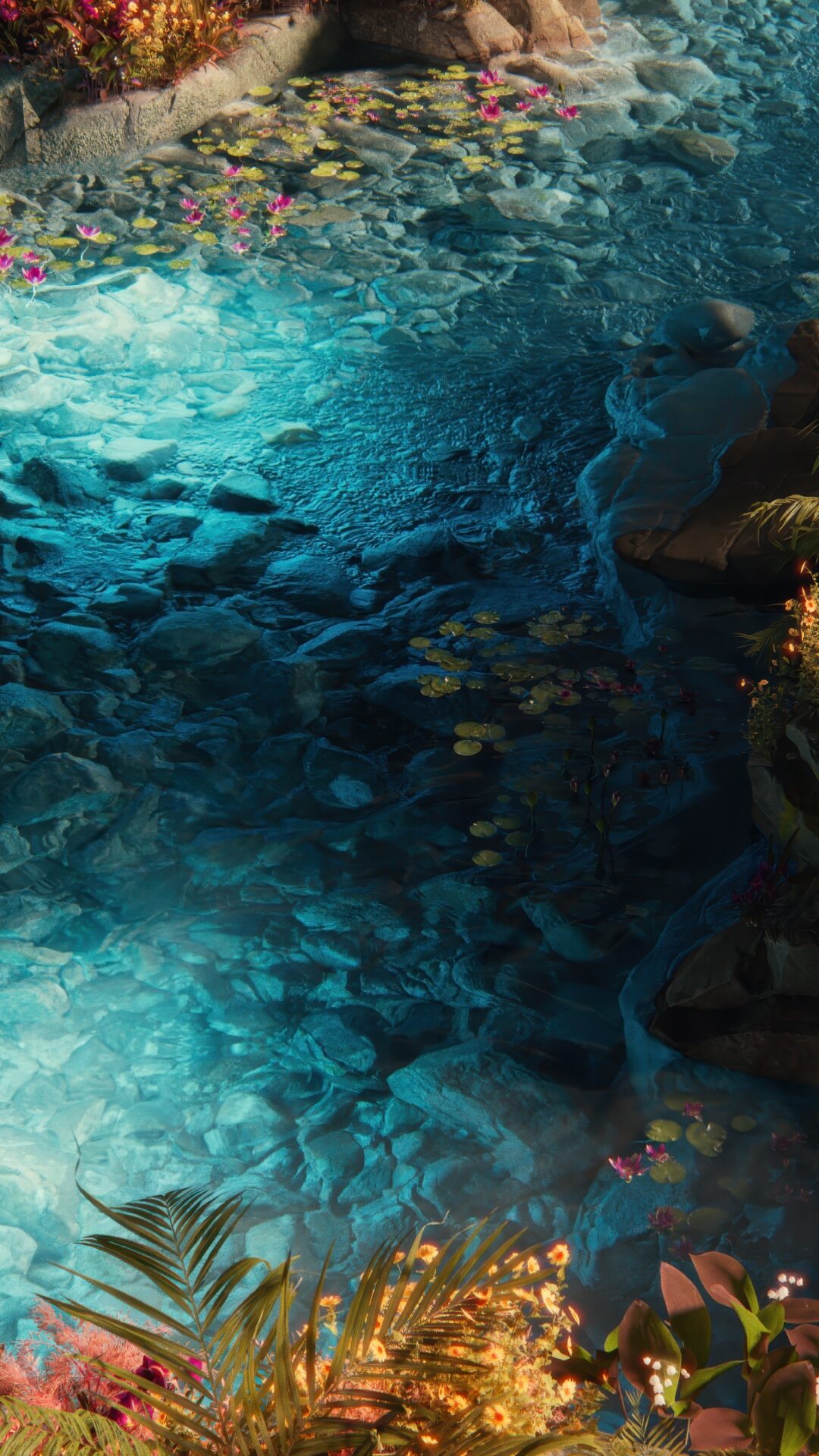 Crystal blue water flows through a magical garden bursting with coral pink, deep purple, and golden yellow flowers along rocky edges. This v…