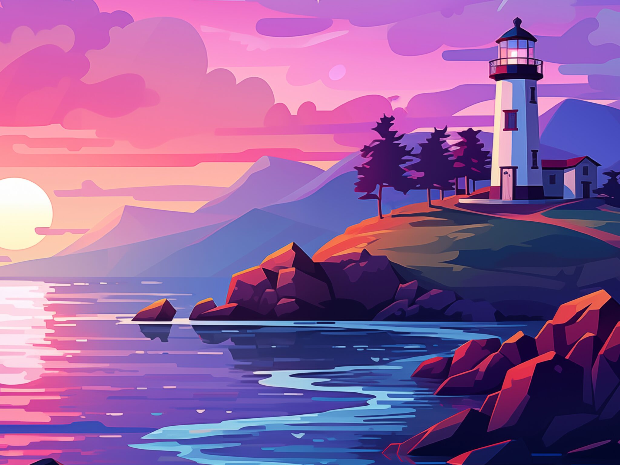 This vibrant coastal scene features a white lighthouse perched on rocky cliffs, bathed in gorgeous pink and purple sunset hues reflecting ac