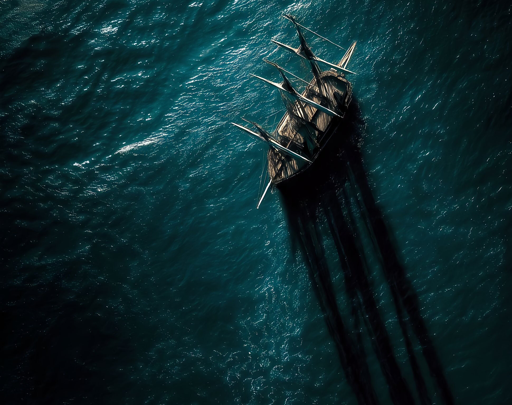 An overhead view shows a longship sailing on a dark blue sea. The ship leaves a long, dark trail in the water, creating a strong contrast wi