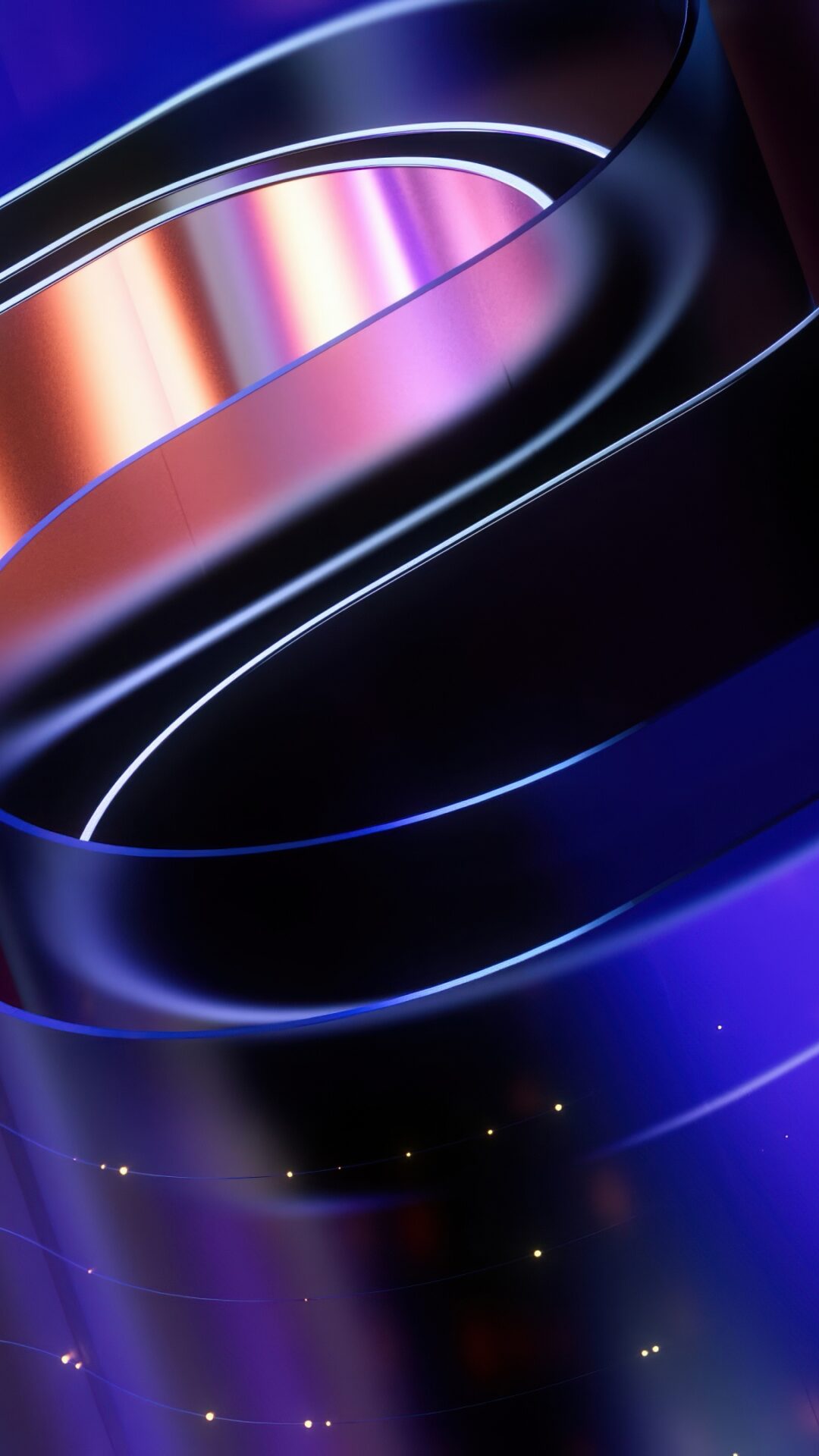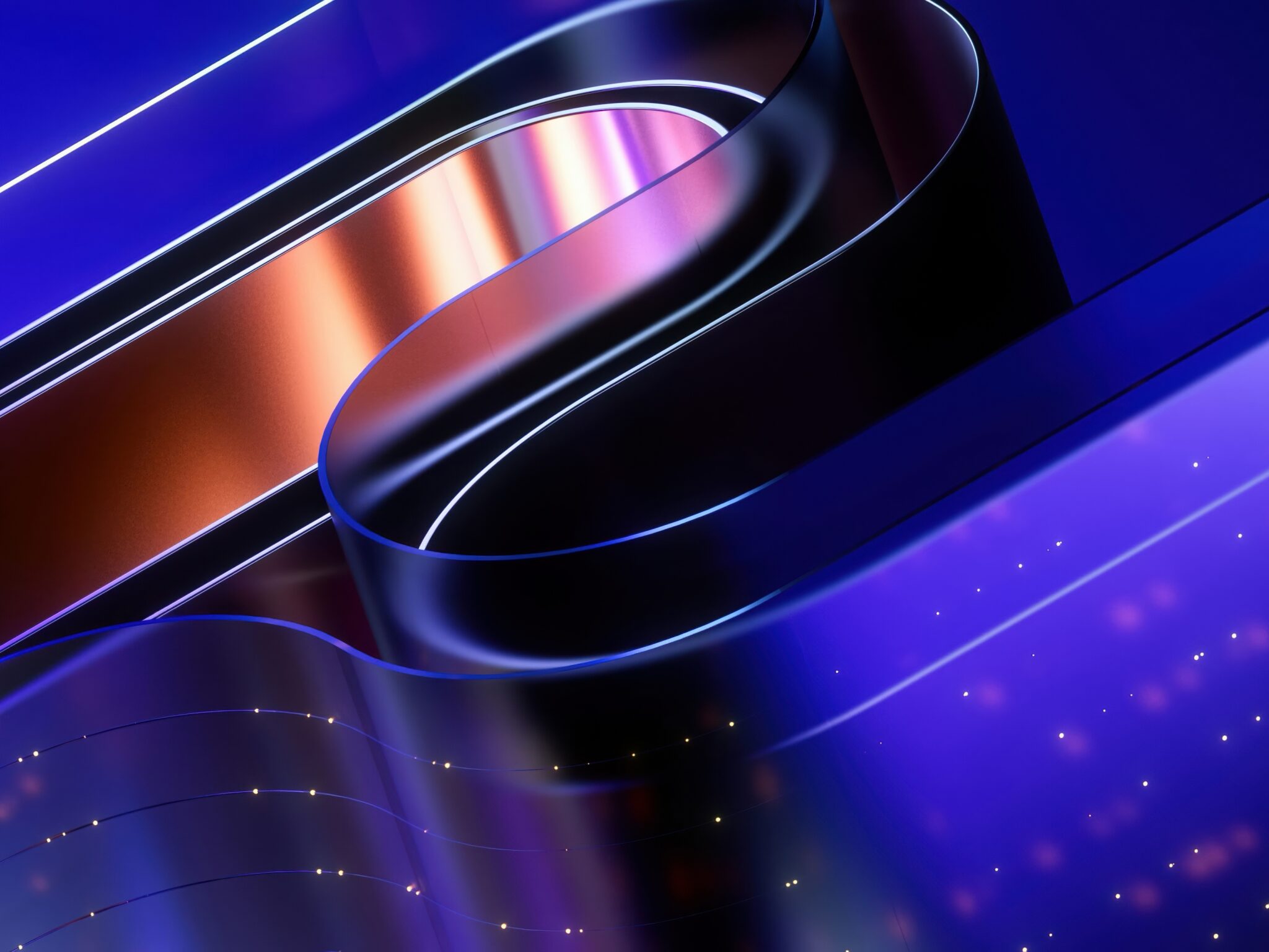 Smooth metallic ribbons curl through deep violet and electric blue space with warm copper reflections catching the light. For 4K monitors, this abstract piece adds some sleek futuristic vibes to your desktop.