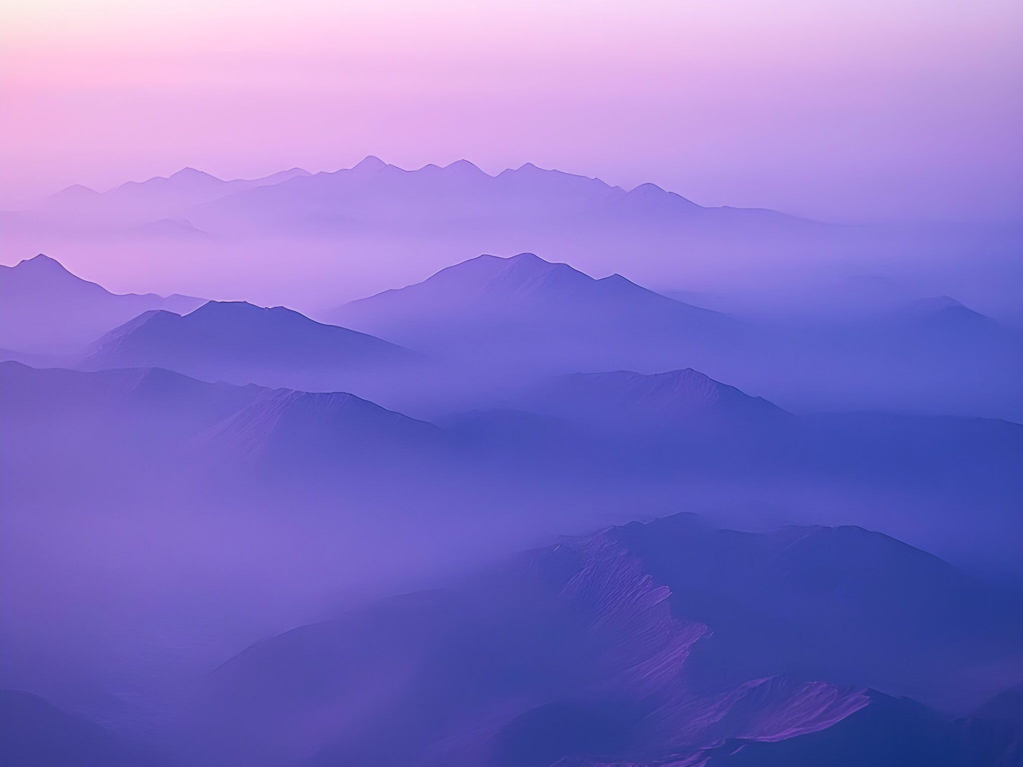 Layers of mountains stretch into the distance under a gradient sky. The scene is softly lit with shades of violet and pink, creating a diffu…