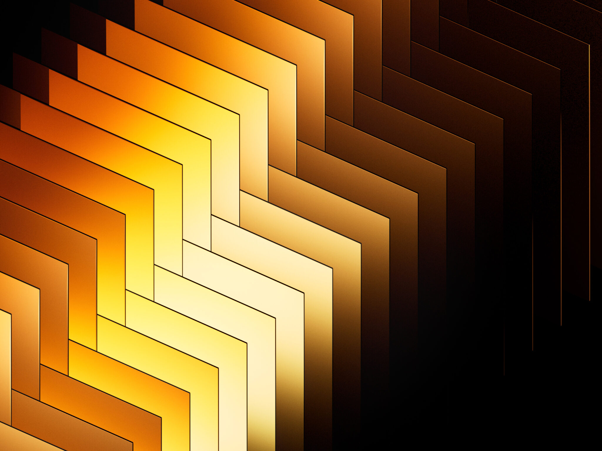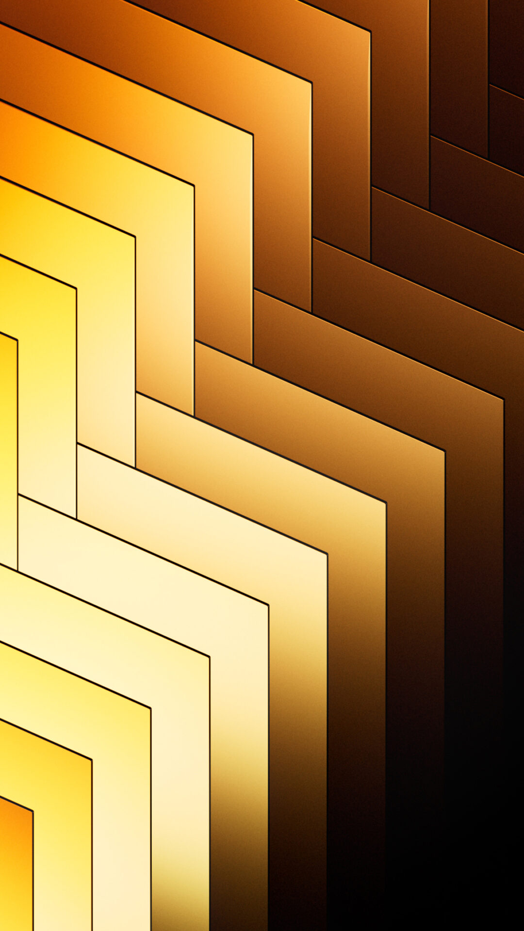 Layered angular shapes in golden yellow, amber, and bronze tones fan out against a dark background, creating a warm geometric pattern with n…