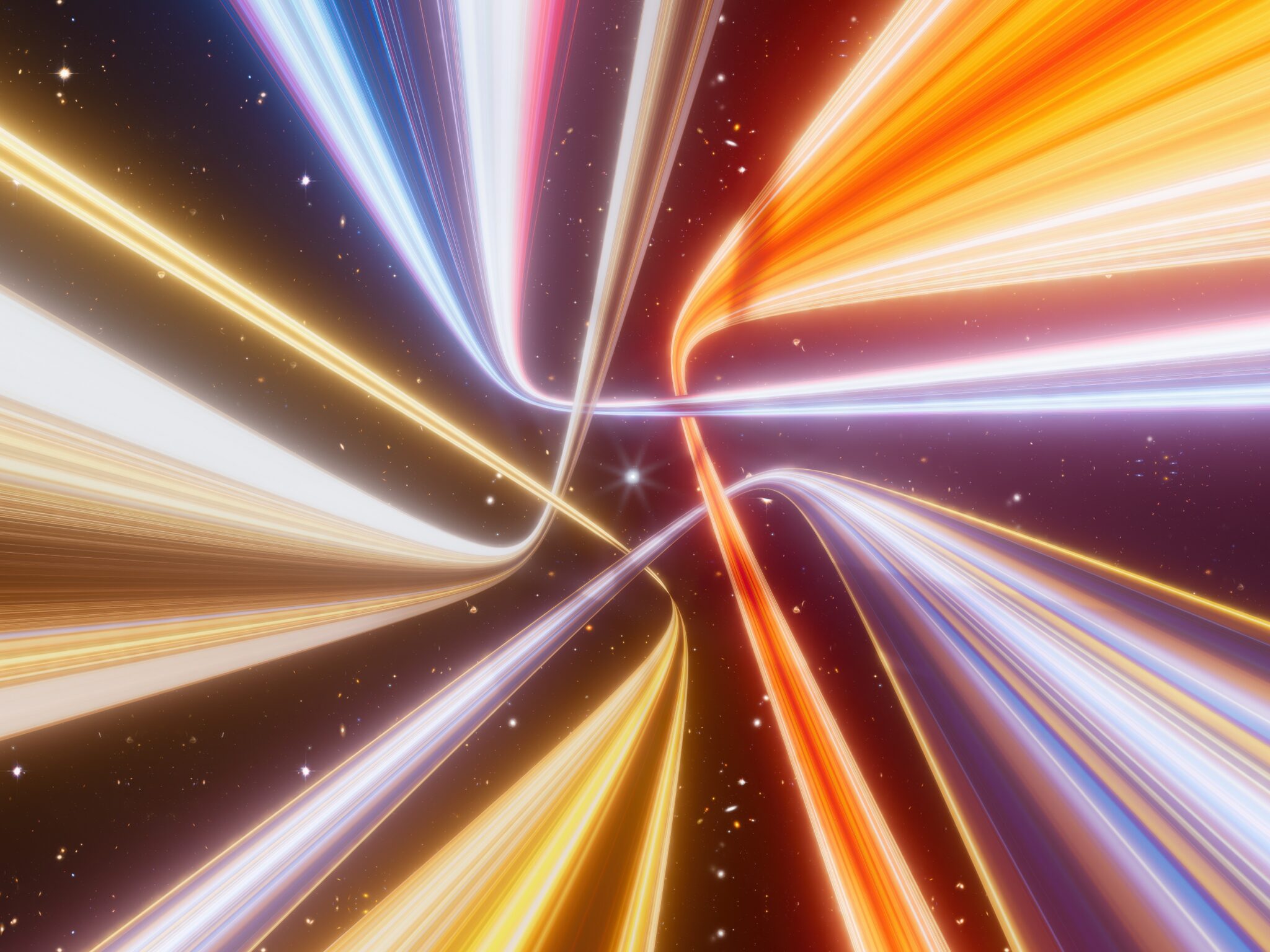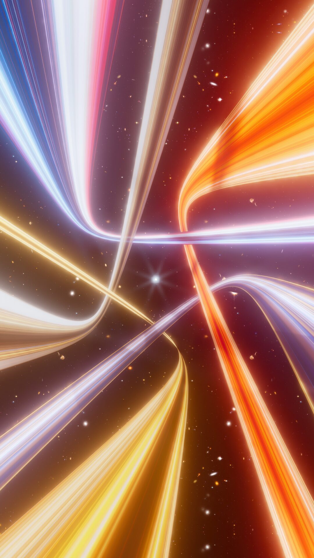 Vibrant light streams in golden yellow, bright orange, deep purple, and electric blue radiate from a central point like you're traveling thr…
