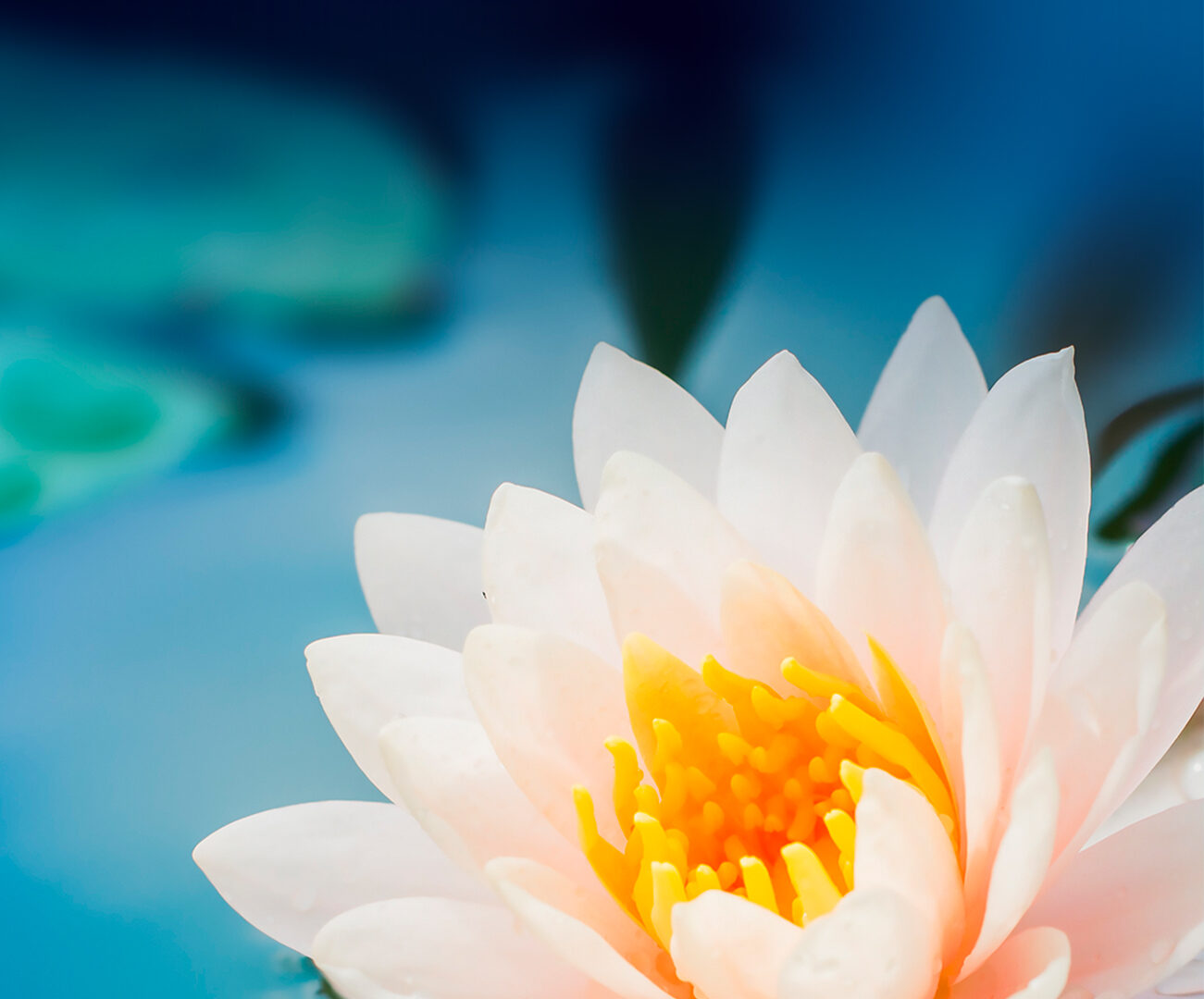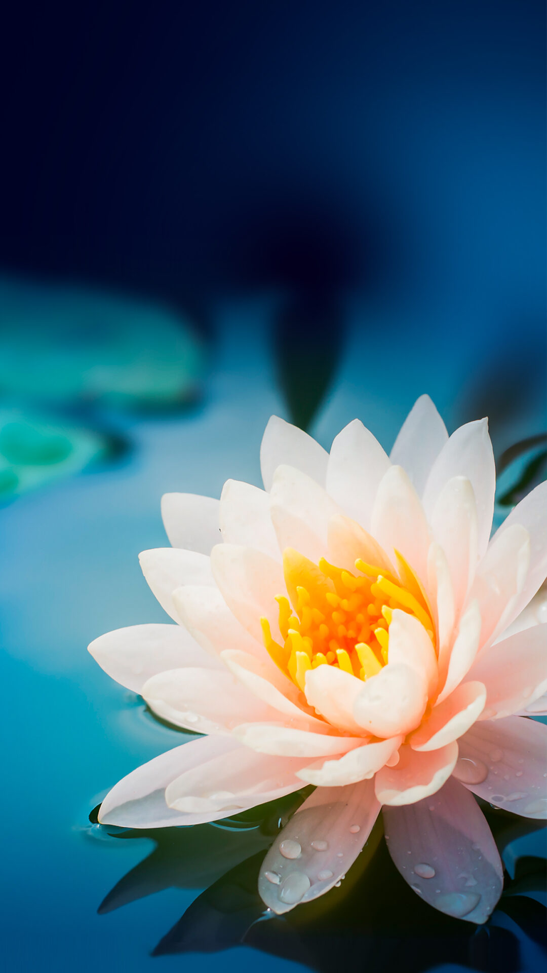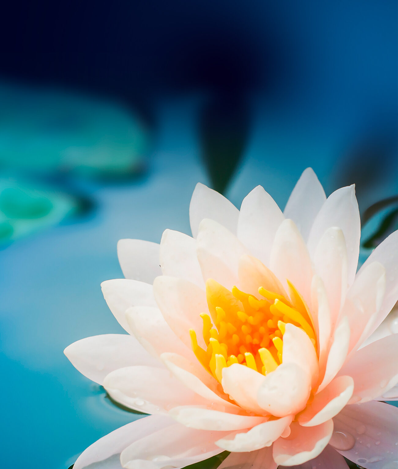 A pale pink water lily is centered in the frame, floating on a dark blue surface. Small water droplets cling to the petals, creating a delic