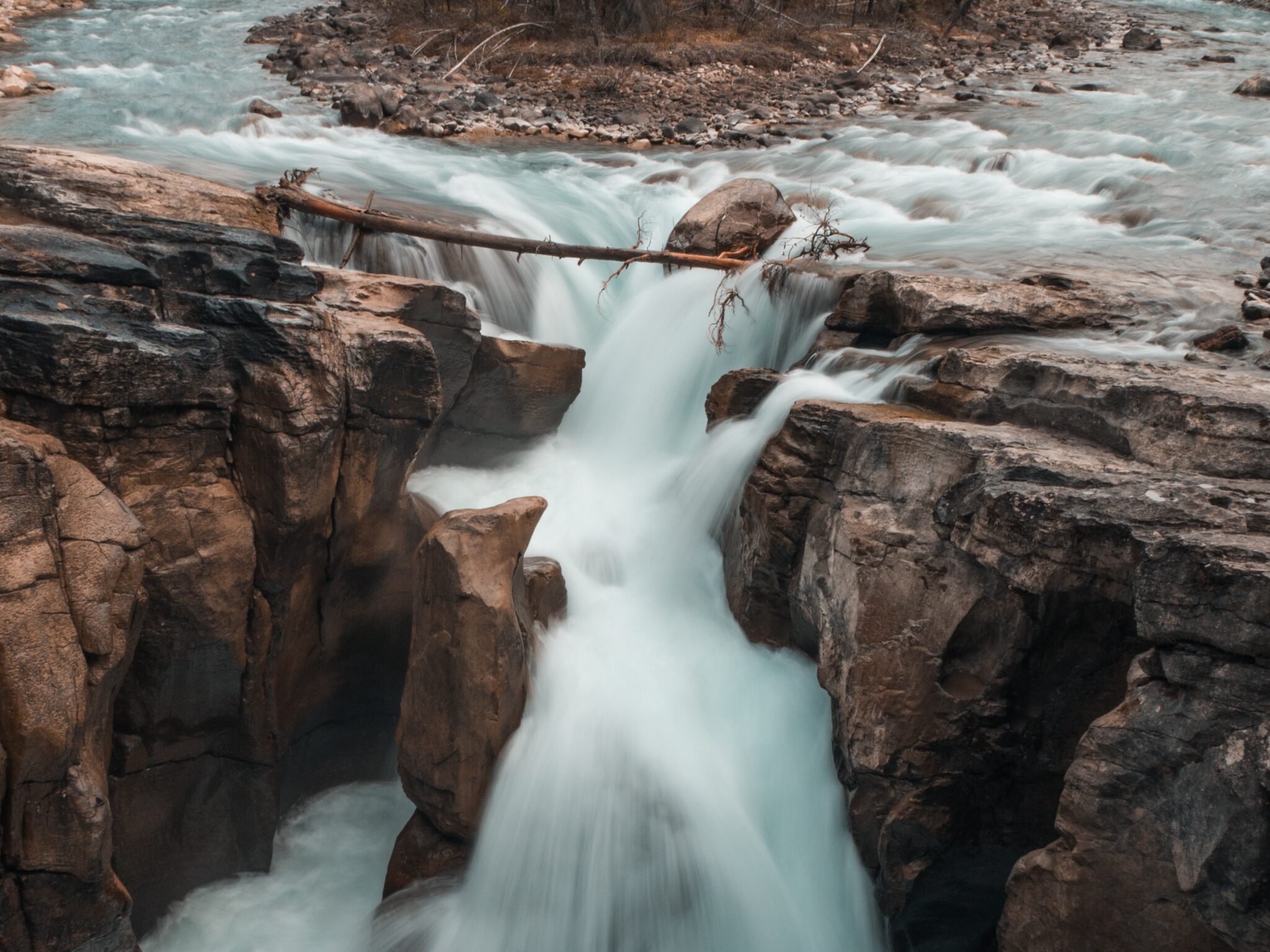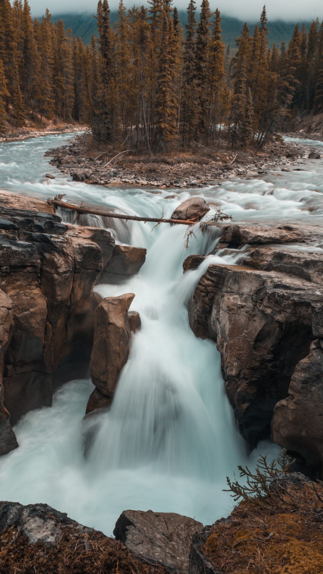 A waterfall cascades over dark rocks into a turquoise river surrounded by a dense evergreen forest. The long exposure creates a smooth, silk…