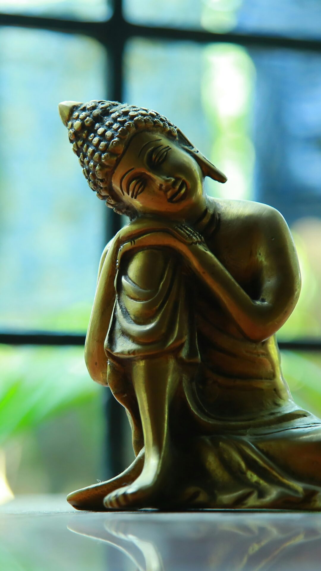 Golden bronze Buddha statue resting peacefully with head tilted on knee, set against a soft blue and green bokeh background from a window with tropical foliage. For 4K monitors, this photography wallpaper brings a calm meditative vibe to your desktop.