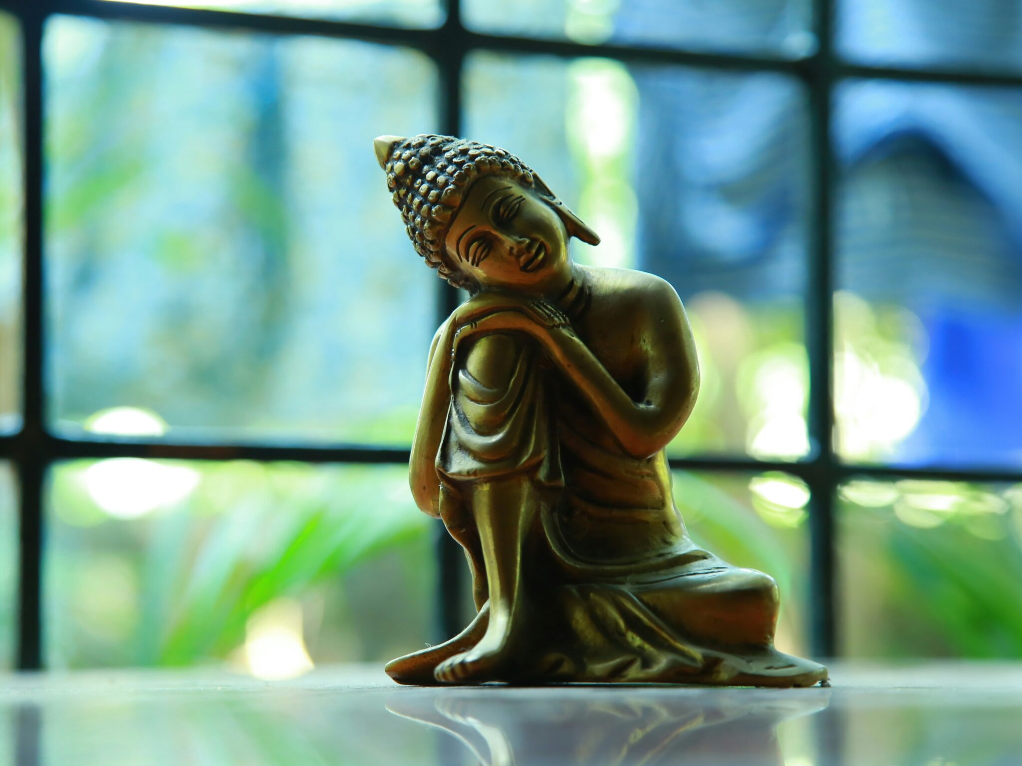 Golden bronze Buddha statue resting peacefully with head tilted on knee, set against a soft blue and green bokeh background from a window wi…