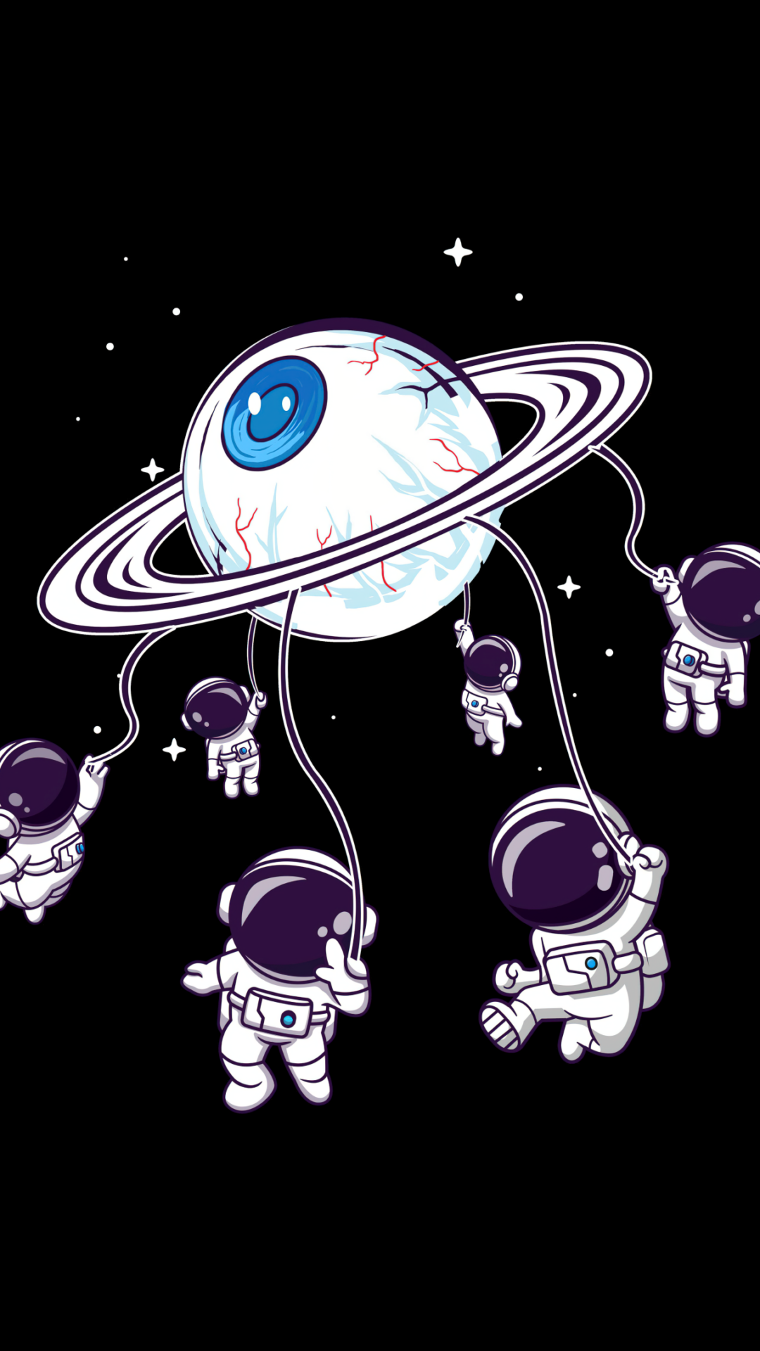 Several cartoon astronauts with purple helmets float around a giant eyeball planet with pink rings against a pure black space background dotted with small stars. This trippy space scene works well for AMOLED phone screens and desktop wallpapers.