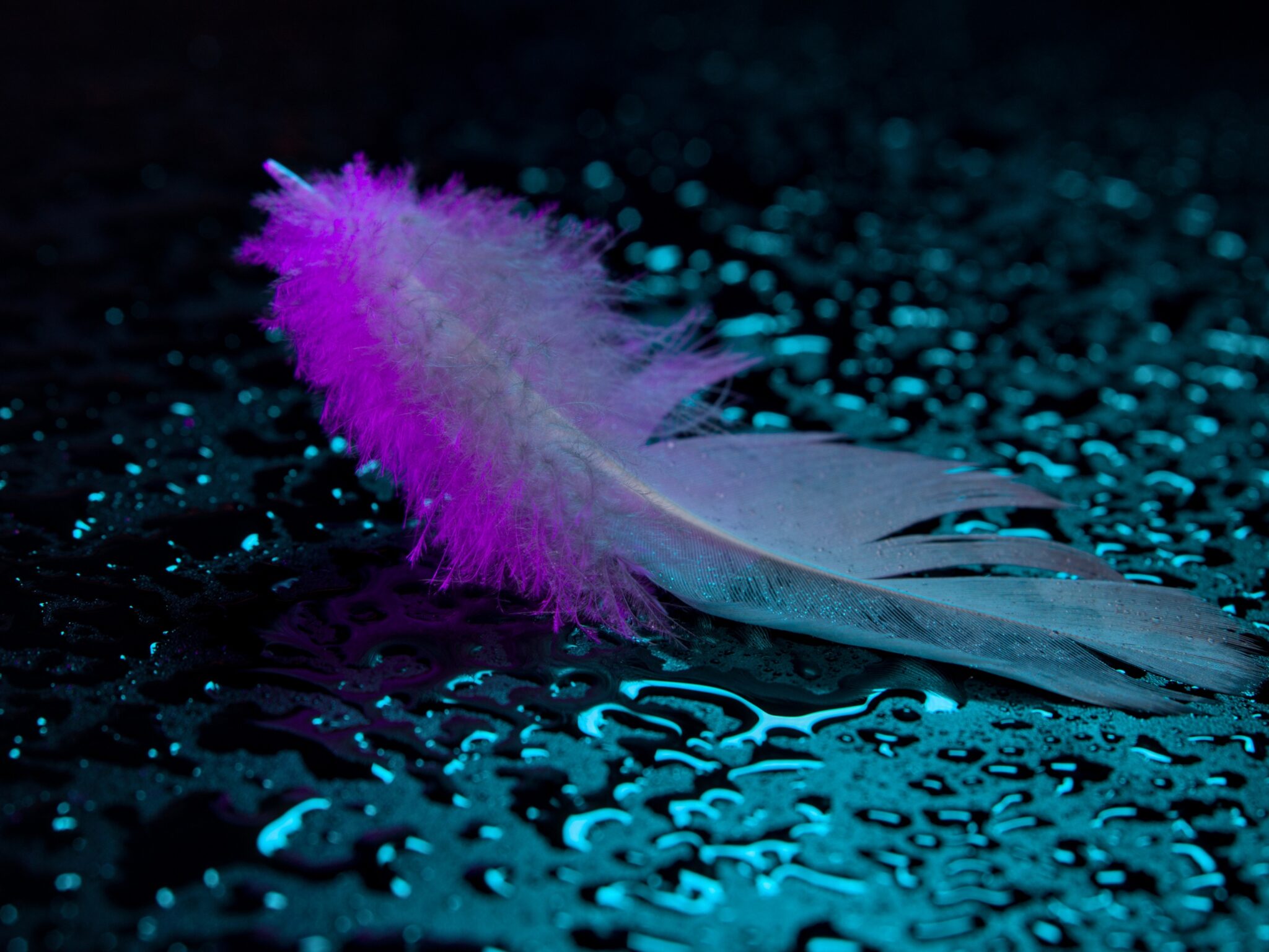 A feather rests on a dark, wet surface covered in small droplets. The feather's tip is highlighted with a saturated magenta glow, contrasting against the cool teal light reflecting from the ground.