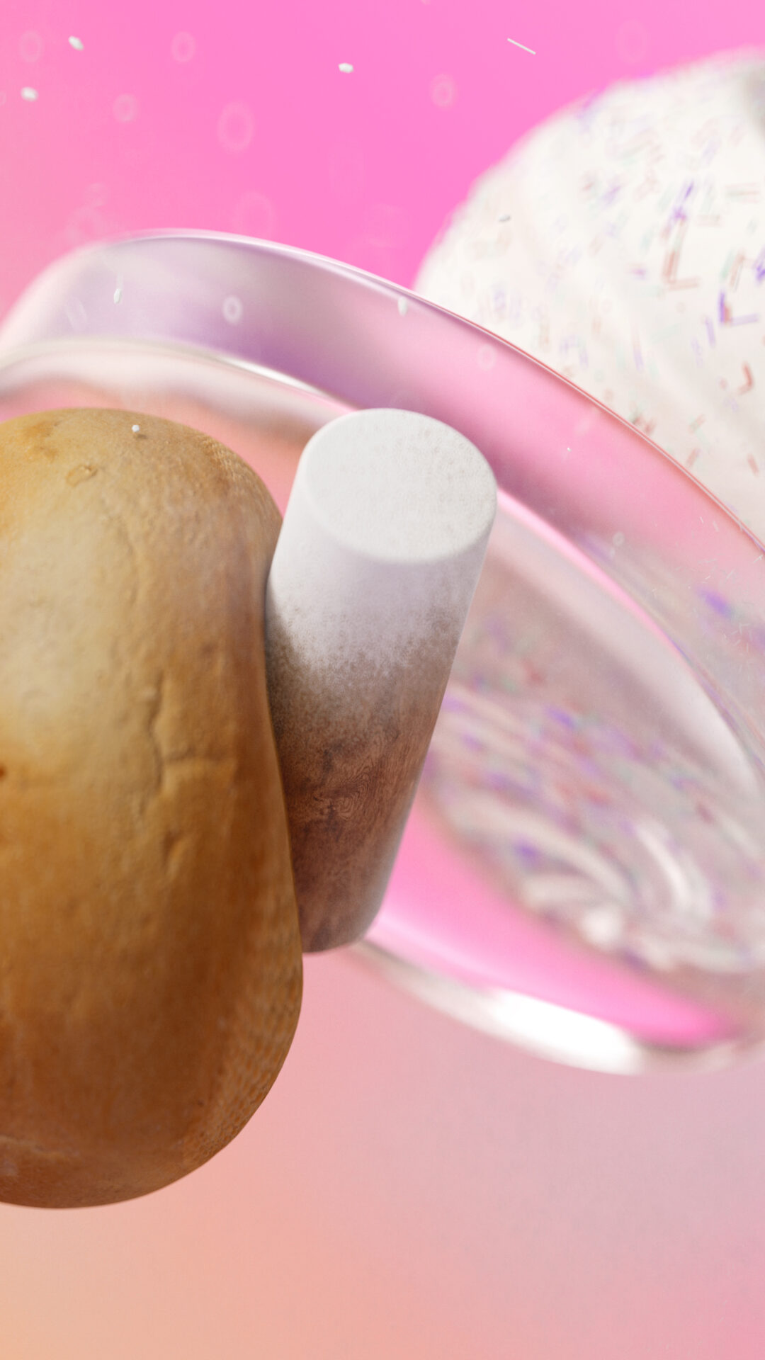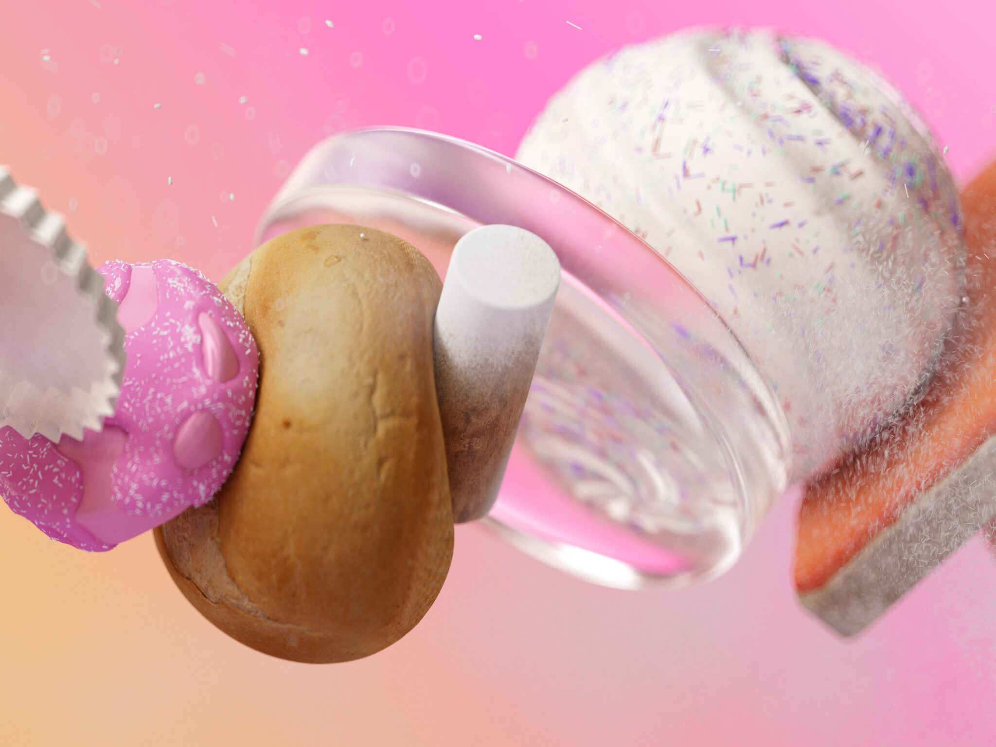 Floating 3D objects like potatoes, pink frosted treats, a glass vessel, and what looks like salmon slices drift across a soft pink-to-peach …