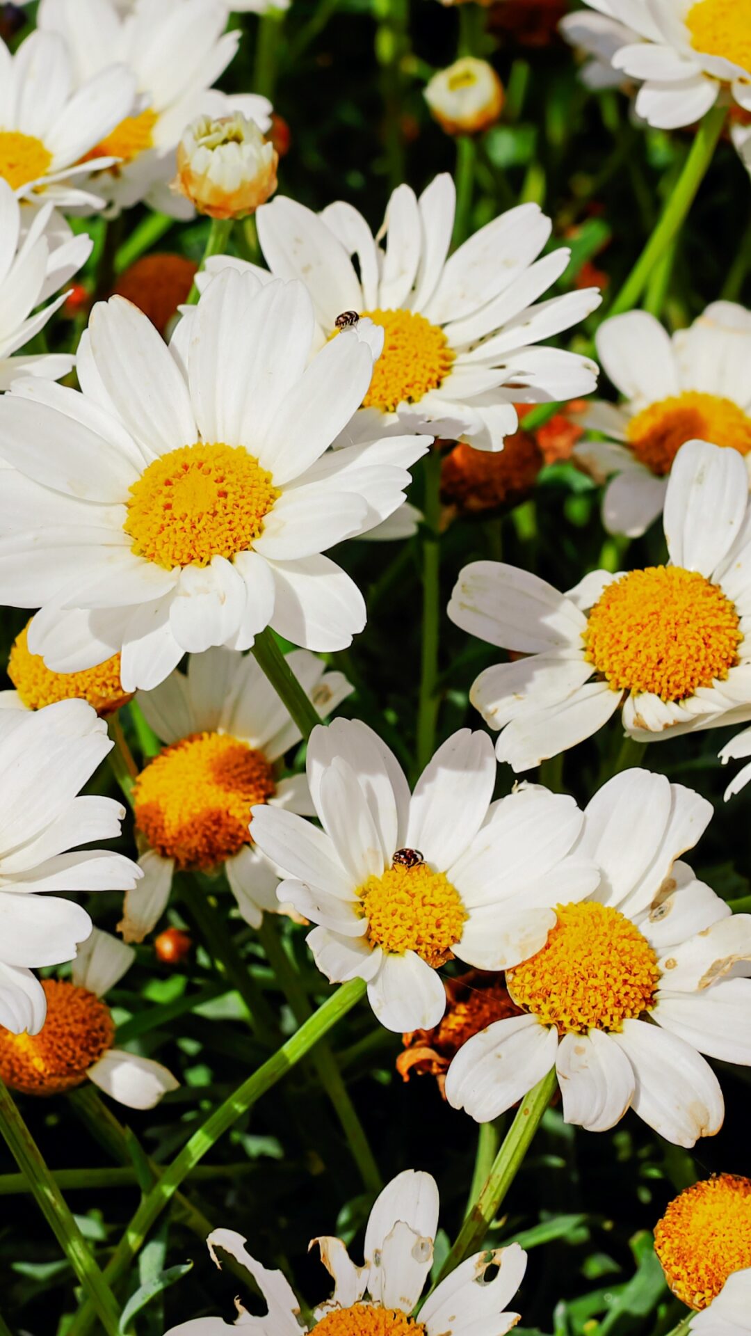 A dense field fills the frame with many small white daisies and yellow centers. Soft sunlight highlights the texture of the petals and the d…