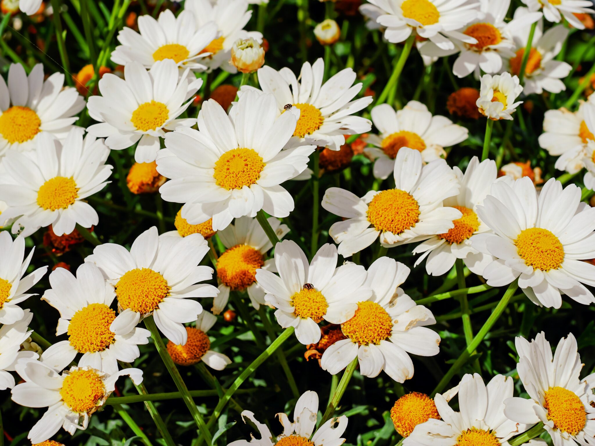 A dense field fills the frame with many small white daisies and yellow centers. Soft sunlight highlights the texture of the petals and the dark green foliage between the blooms.