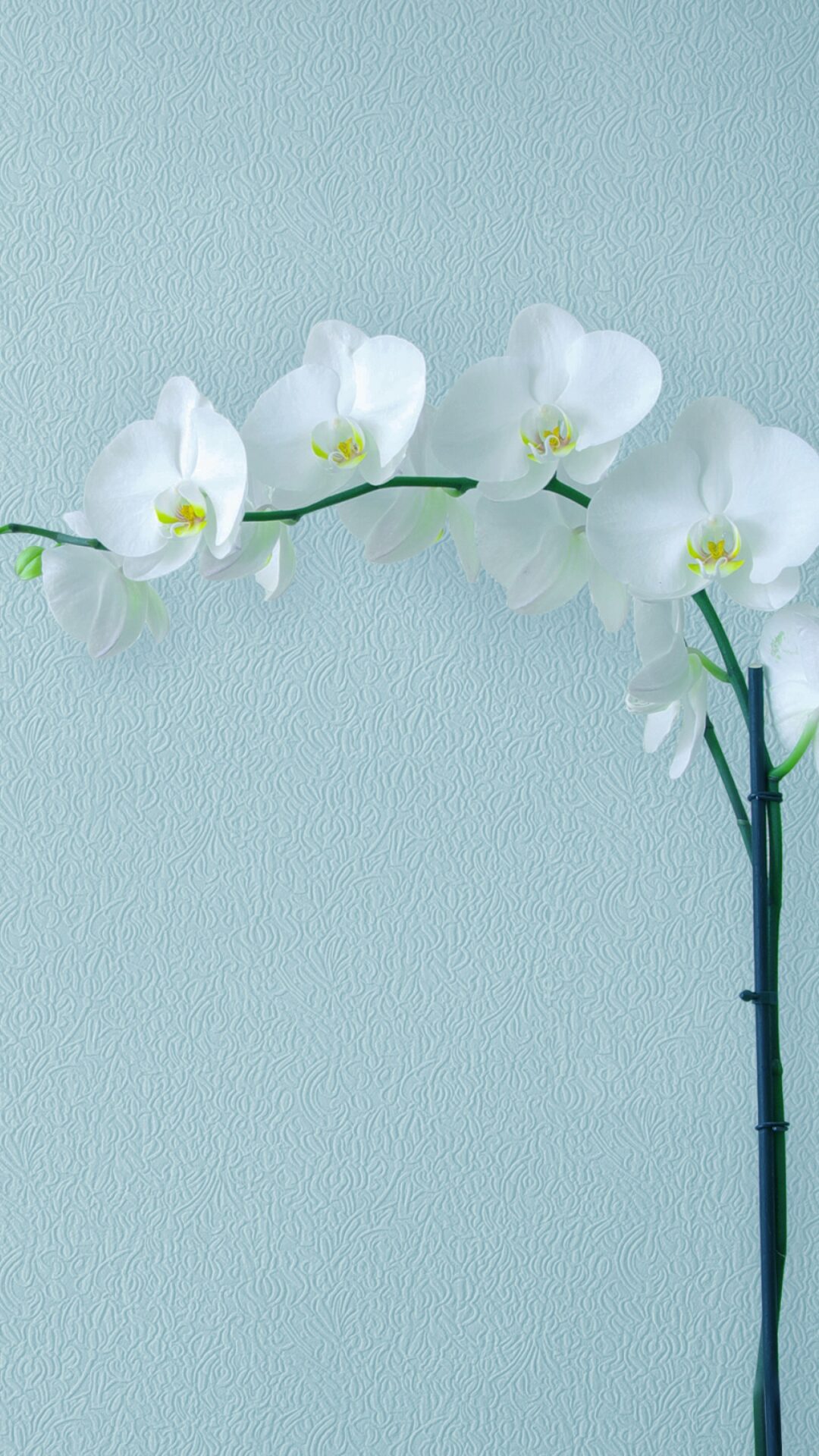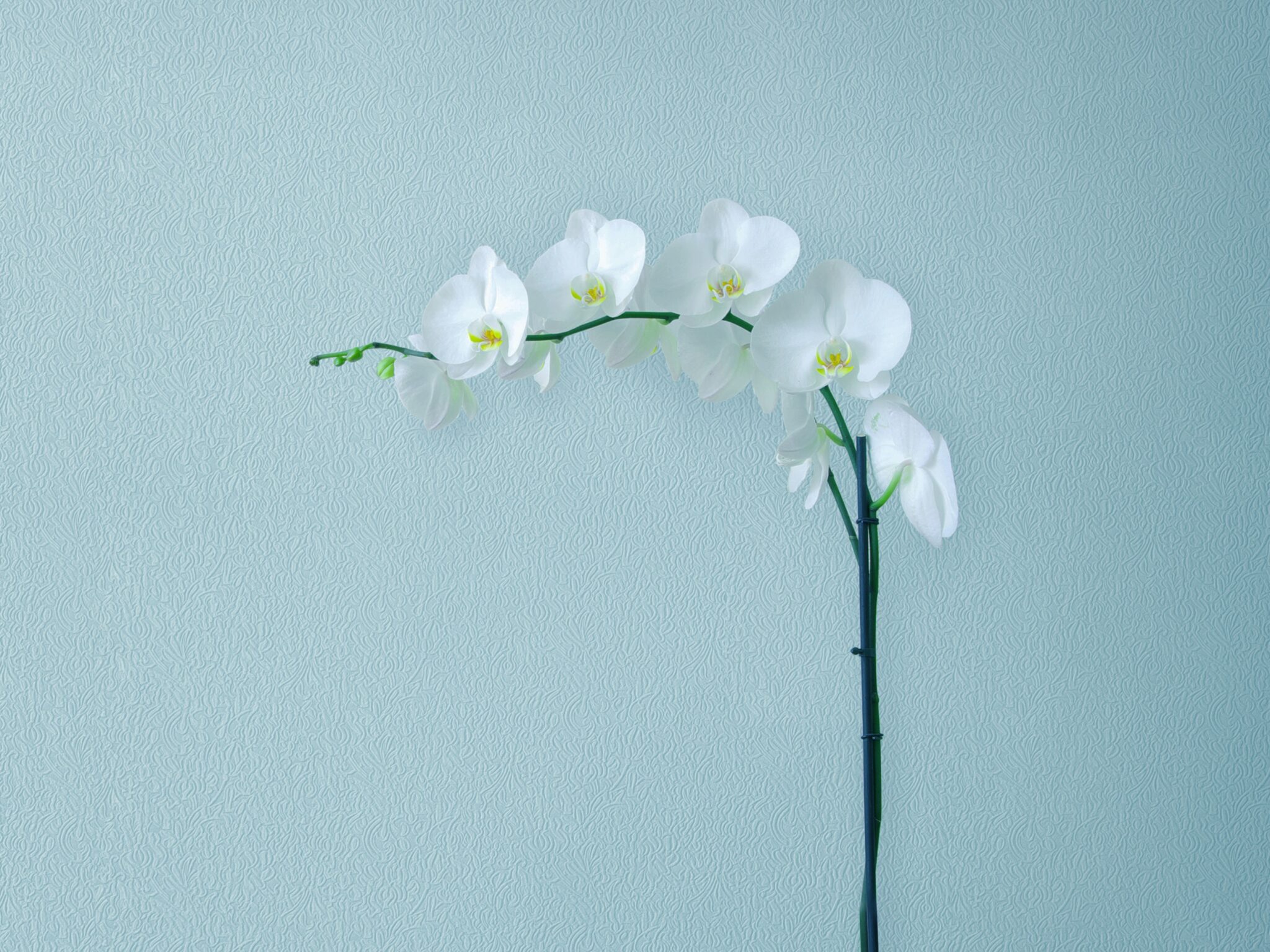 A white orchid stem with several blossoms curves across a light blue background. The petals have delicate yellow and purple markings near th…