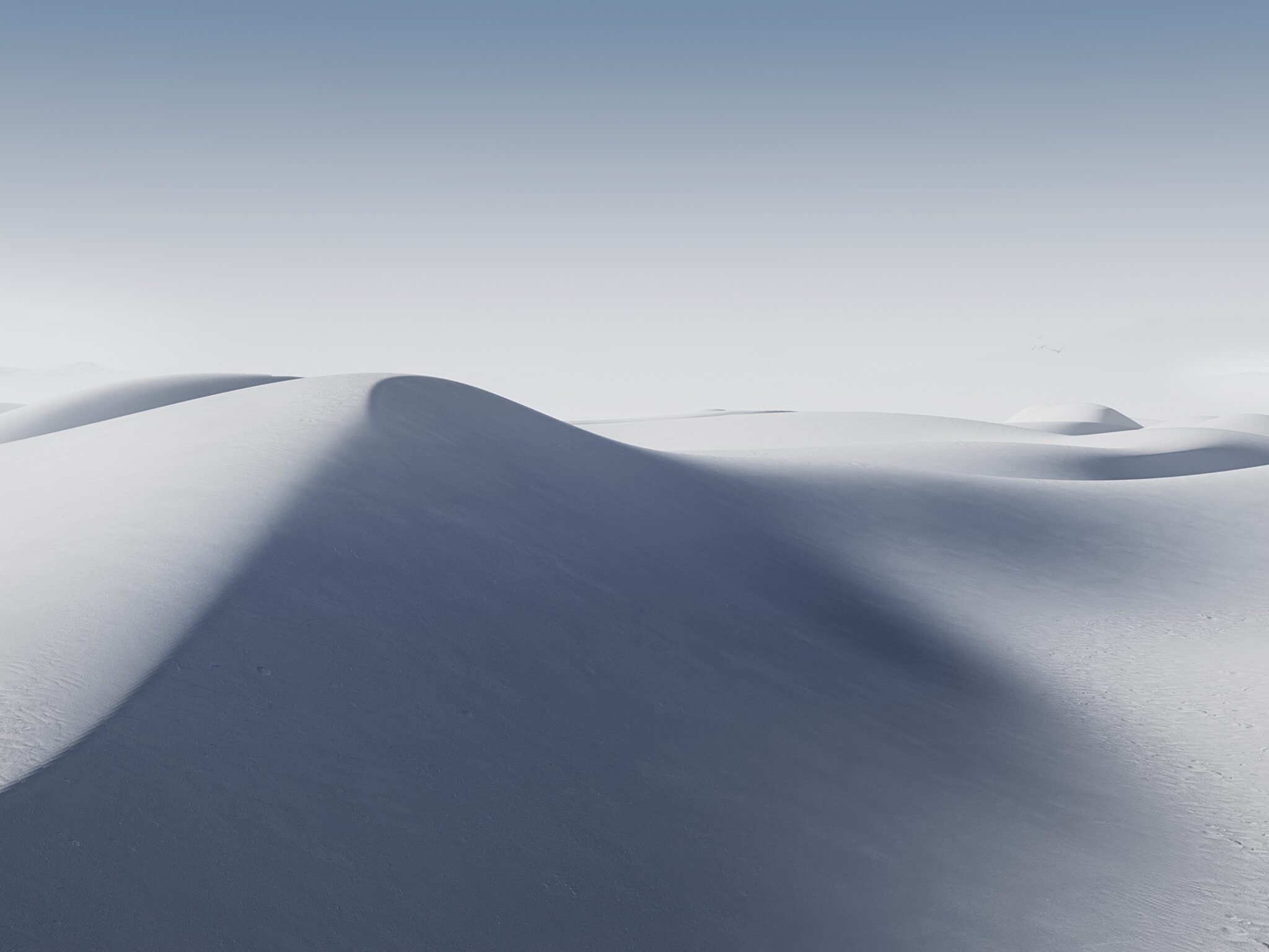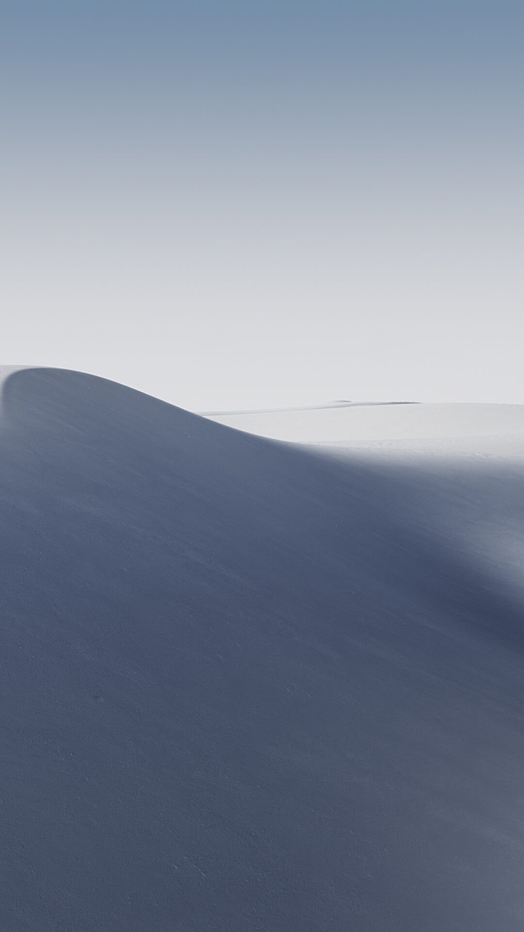Smooth white sand dunes create flowing curves under soft blue-gray shadows and a pale gradient sky. Clean minimalist wallpaper for ultrawide