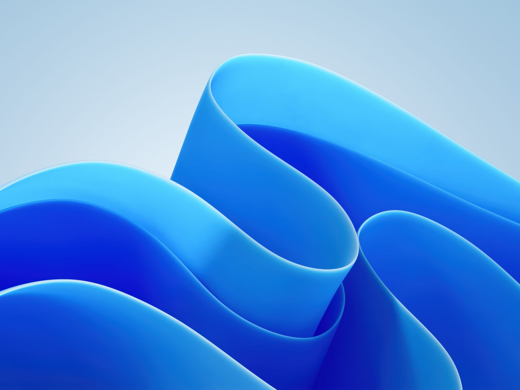 Smooth flowing ribbons in sky blue and deeper cobalt curl and fold against a soft gradient background, giving off that signature Windows 11