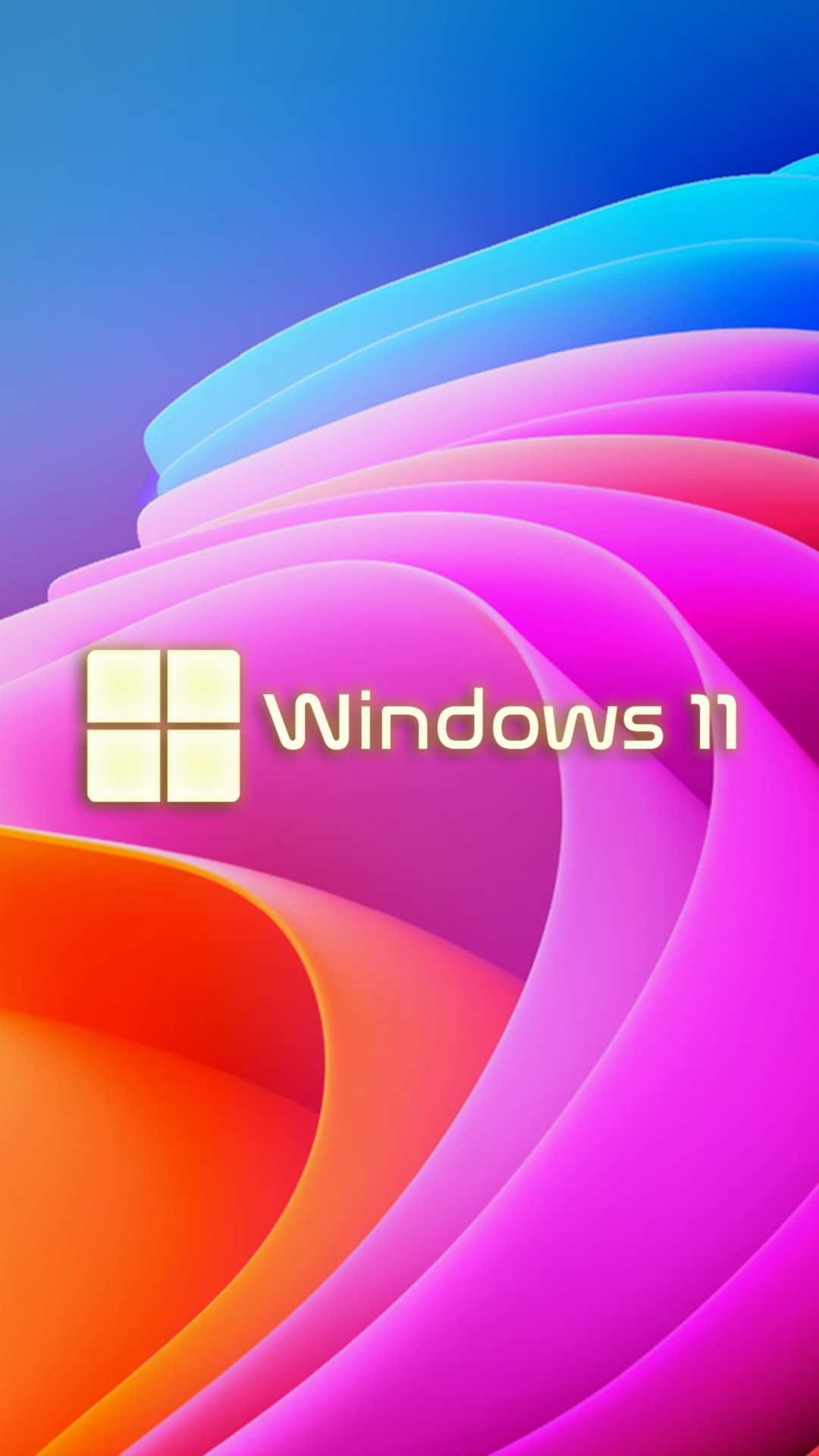 Curved layers of purple, orange, and blue form an abstract shape with the Windows 11 logo centered within. The smooth gradient and overlappi