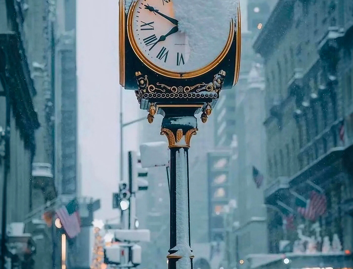 A vintage street clock stands covered in snow along a city street with tall buildings. Light is diffused by the overcast sky, giving a cool and muted tone to the scene.