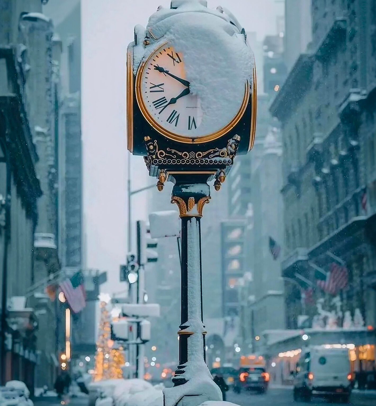 A vintage street clock stands covered in snow along a city street with tall buildings. Light is diffused by the overcast sky, giving a cool and muted tone to the scene.