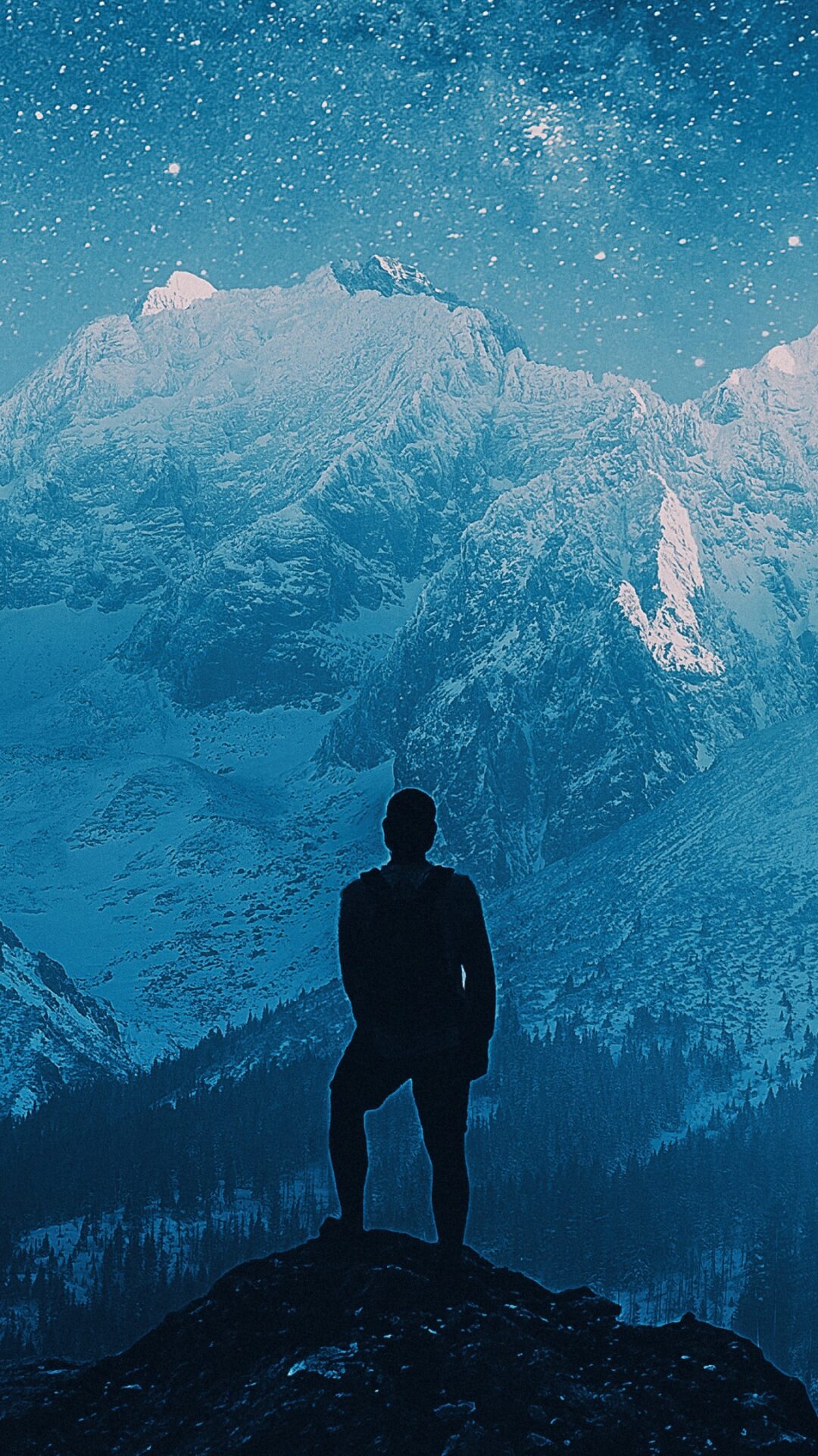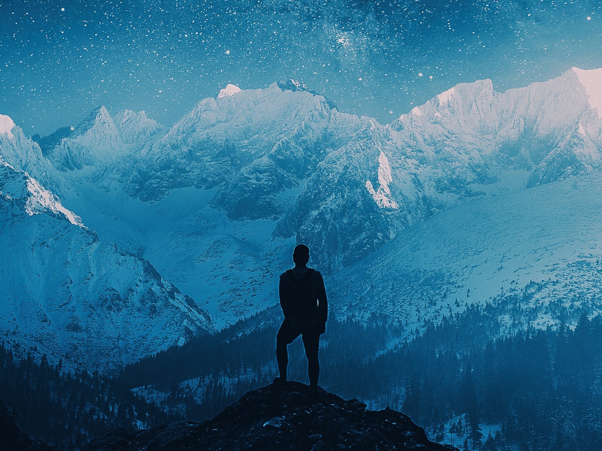 Someone stands alone on a rocky outcrop beneath a star-filled sky, with snow-covered mountain peaks bathed in soft blue and pink twilight hu
