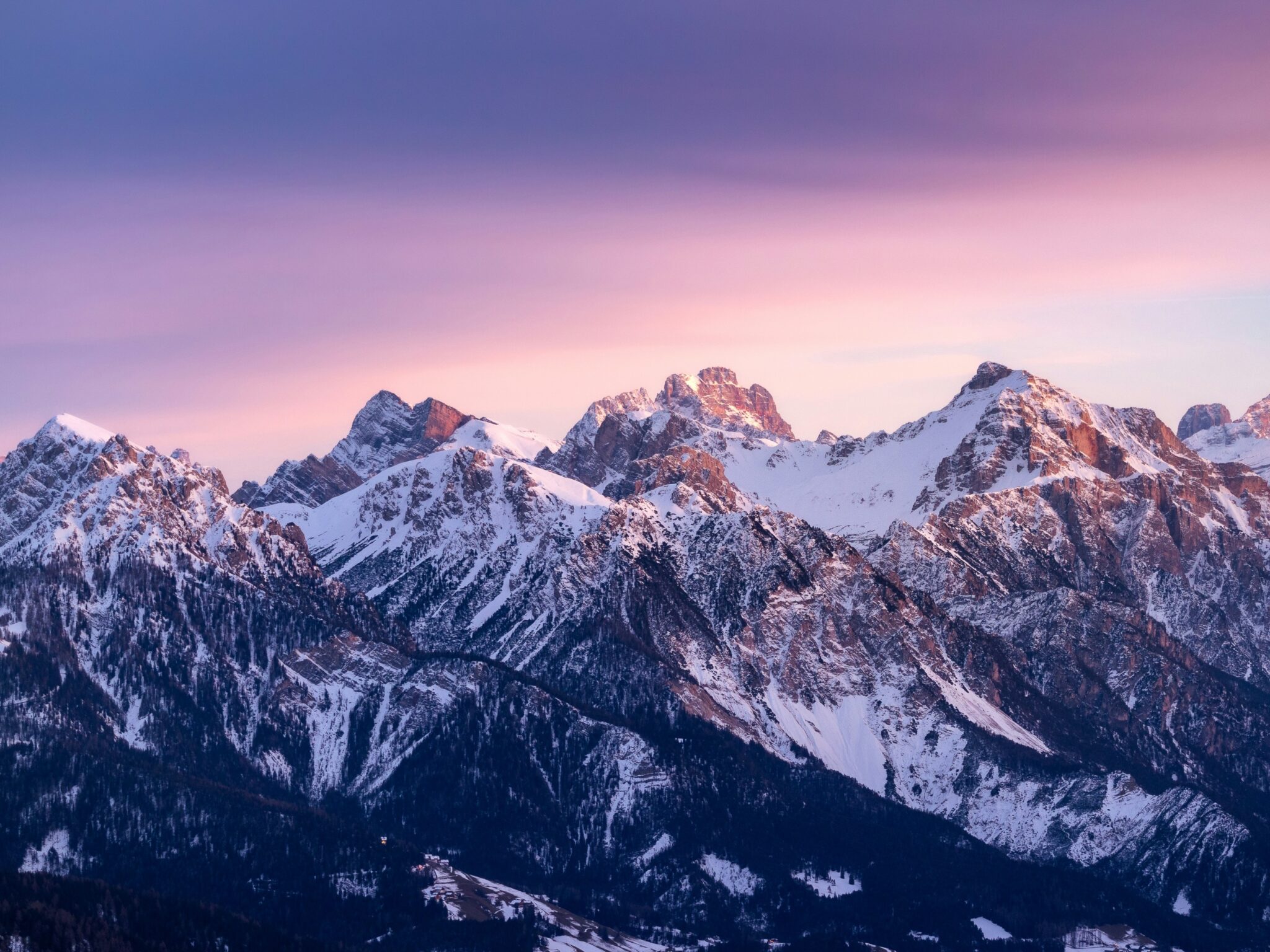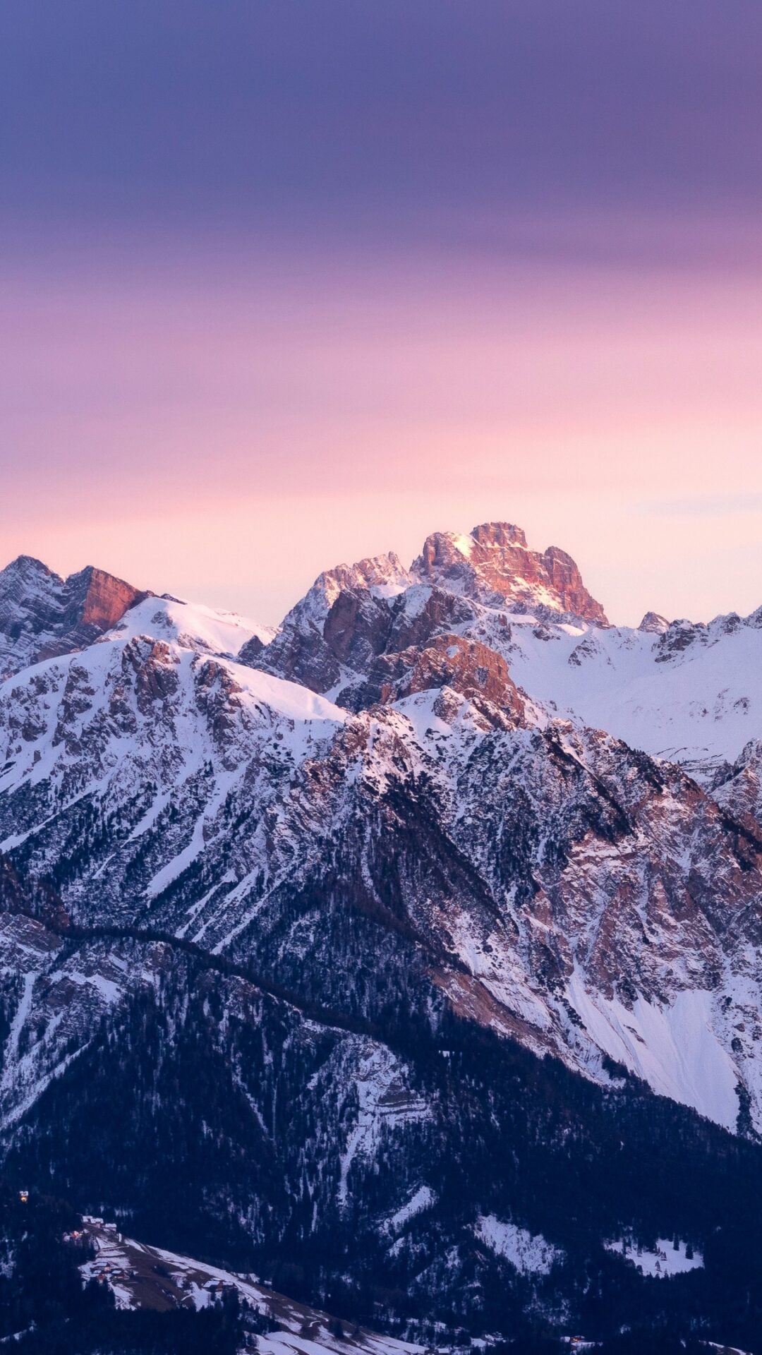 Snow-capped mountain peaks catch warm golden light against a soft gradient sky shifting from dusty pink to pale lavender and blue. For 4K mo