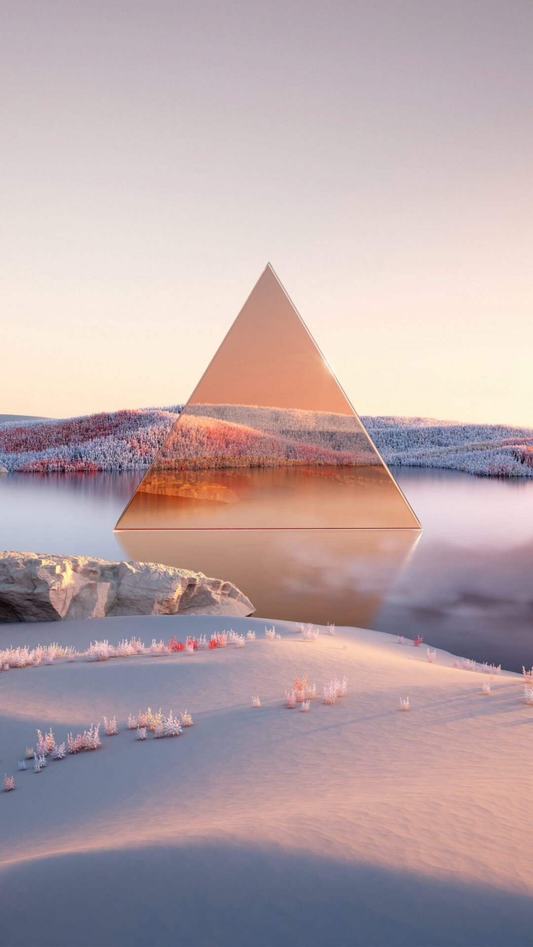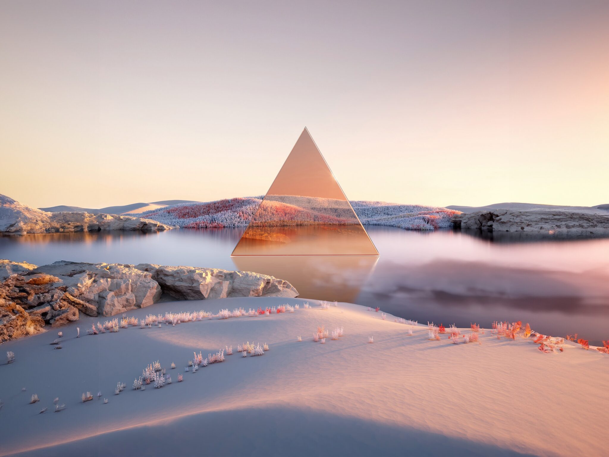 A geometric pyramid stands in a snowy landscape reflecting on calm water. The soft, warm light of sunset creates a hazy atmosphere and empha