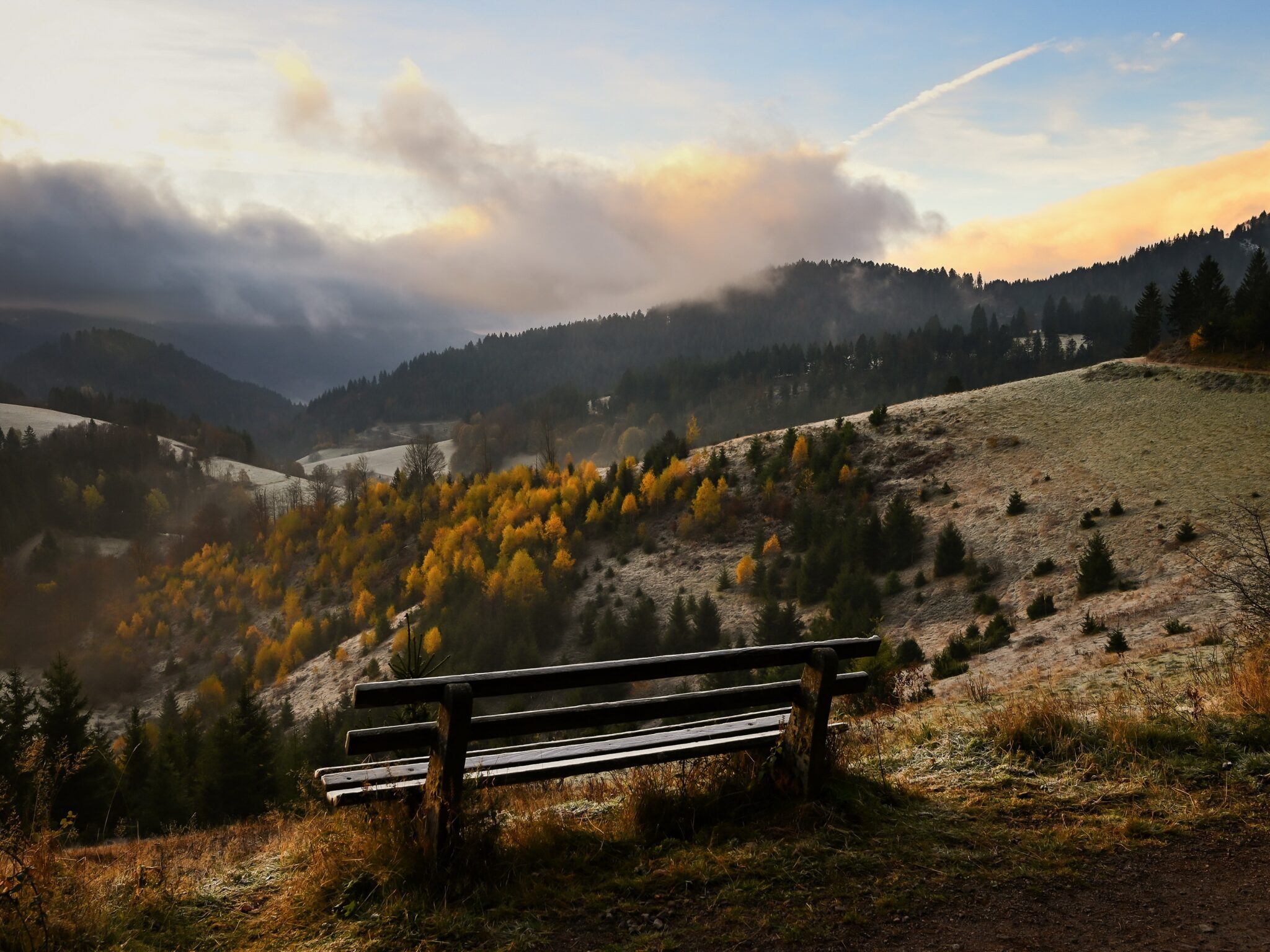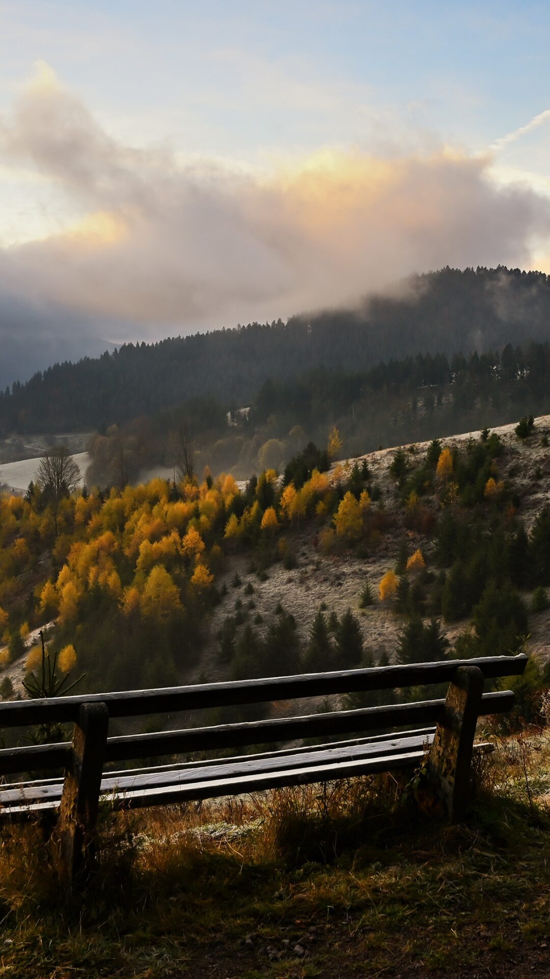 A lone bench sits on a grassy hillside gazing out over a misty valley of golden trees and rolling mountains. The warm glow breaking through the clouds gives it that quiet, end-of-day solitude feel.
