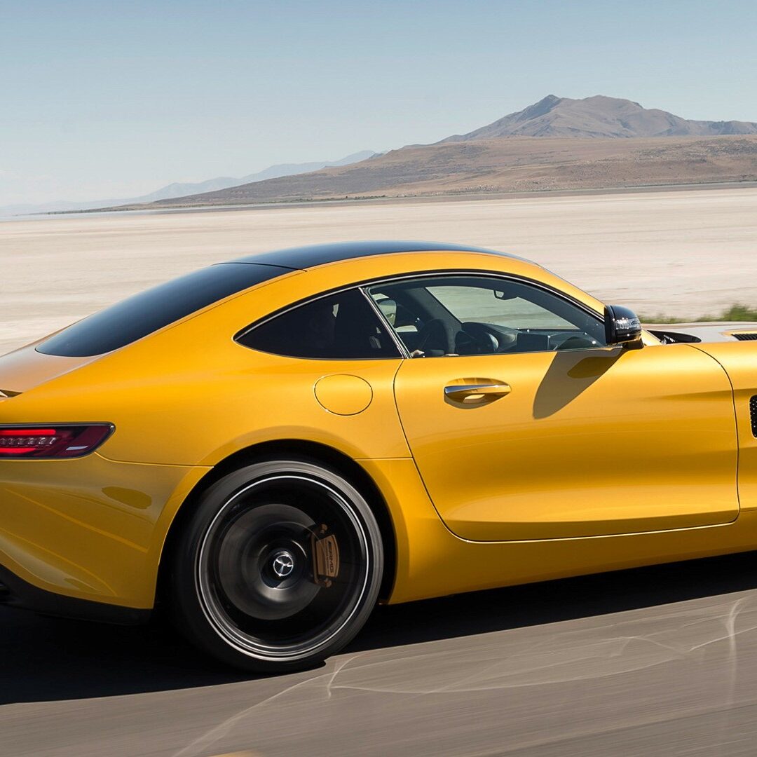 A yellow Mercedes-AMG GT is driving along an asphalt road with a distant mountain range. The car’s glossy paint reflects bright sunlight, creating smooth highlights across the body.