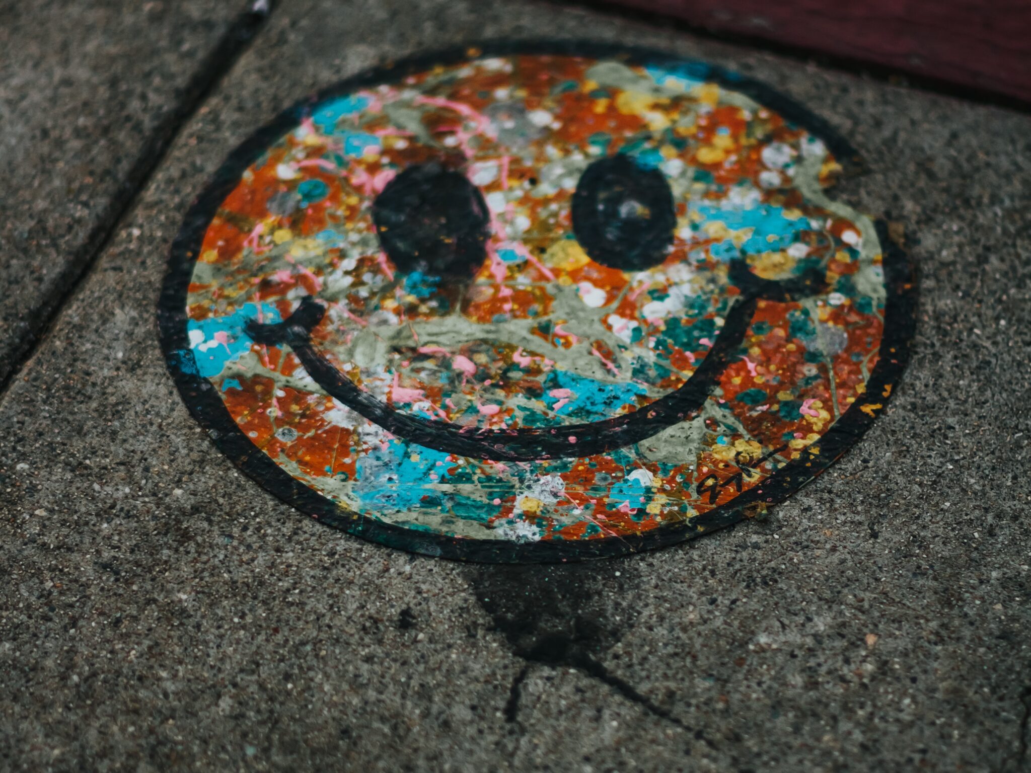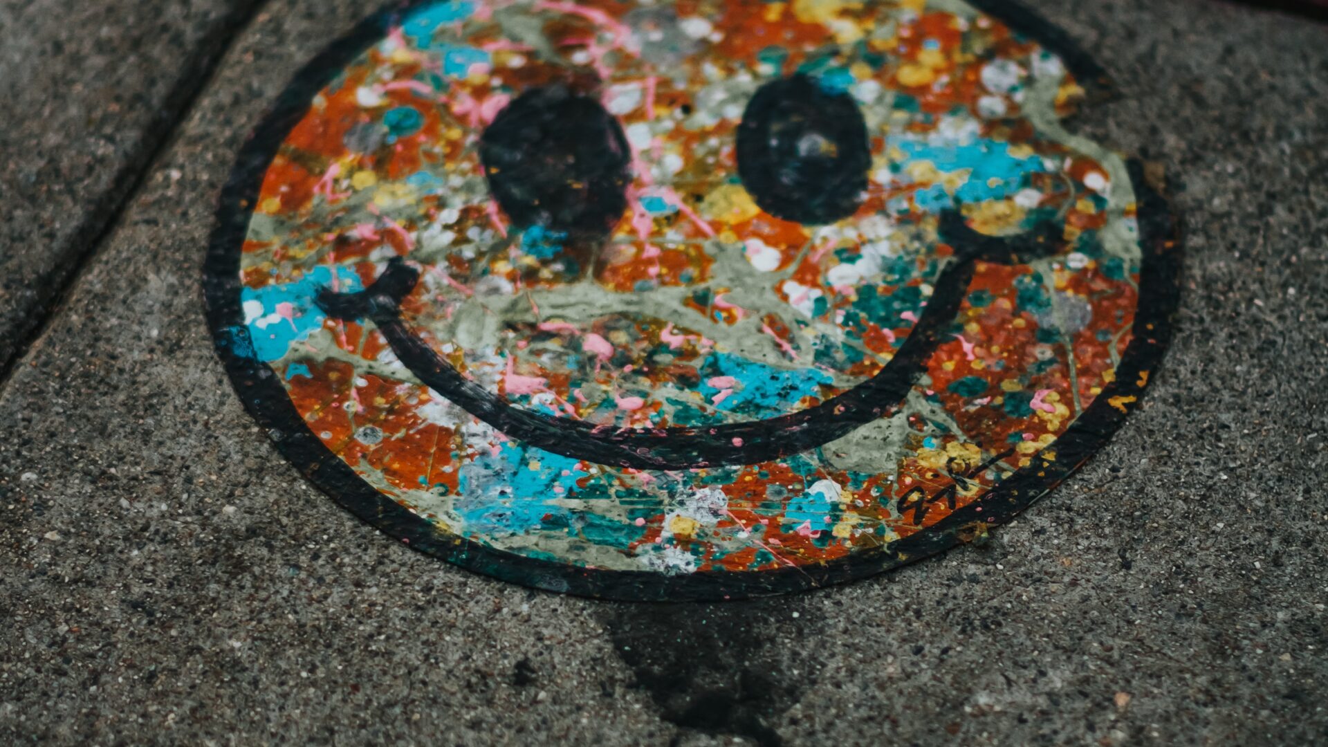 A bright yellow smiley face painted thick and rough on a dark grey wall, close enough to see every brushstroke. The contrast between the cru…
