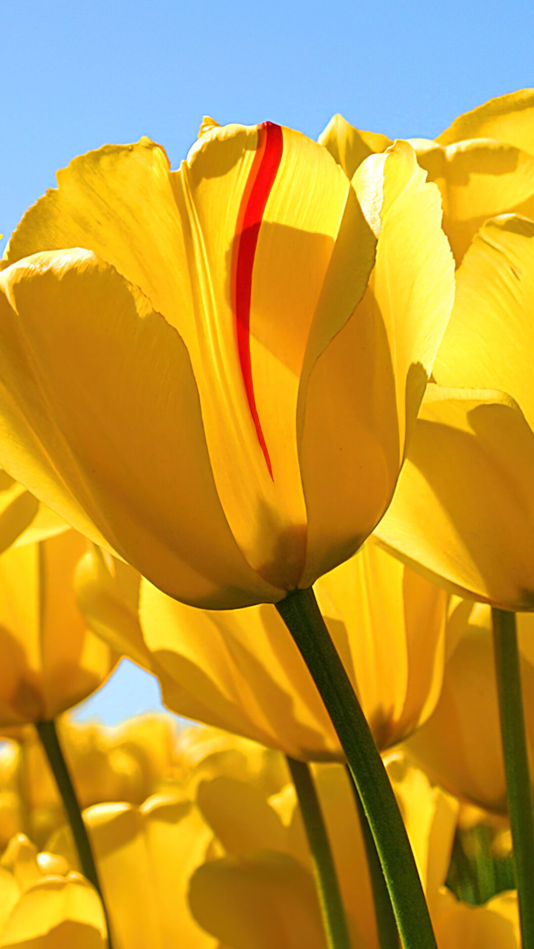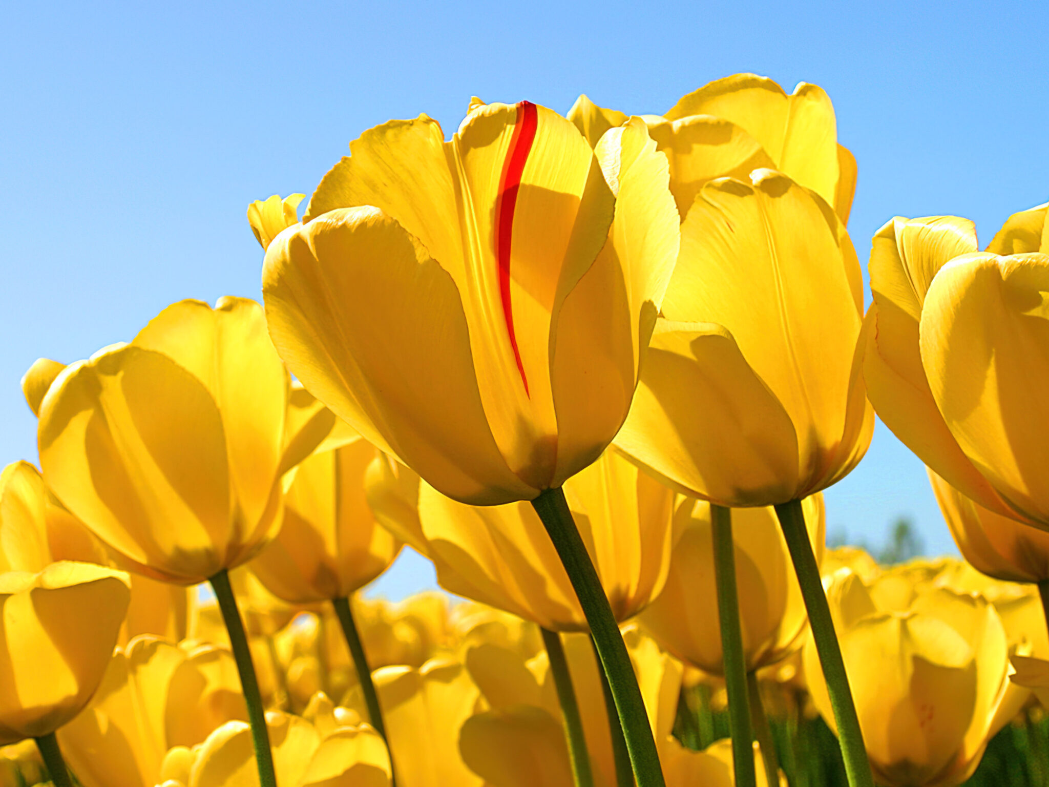 Close-up of a field filled with yellow tulips under a clear blue sky. One tulip stands out with a single red stripe running down its petal, catching the sunlight.
