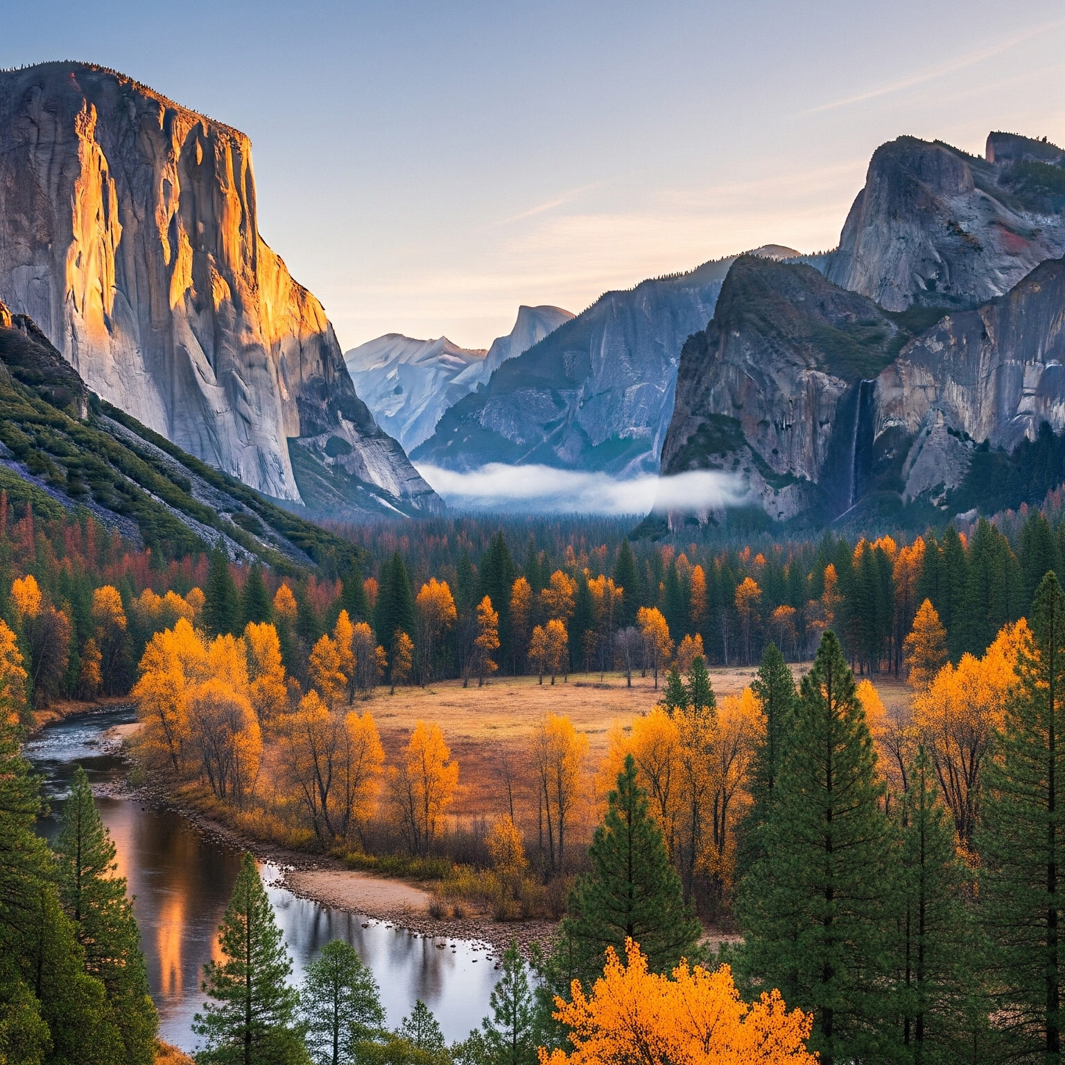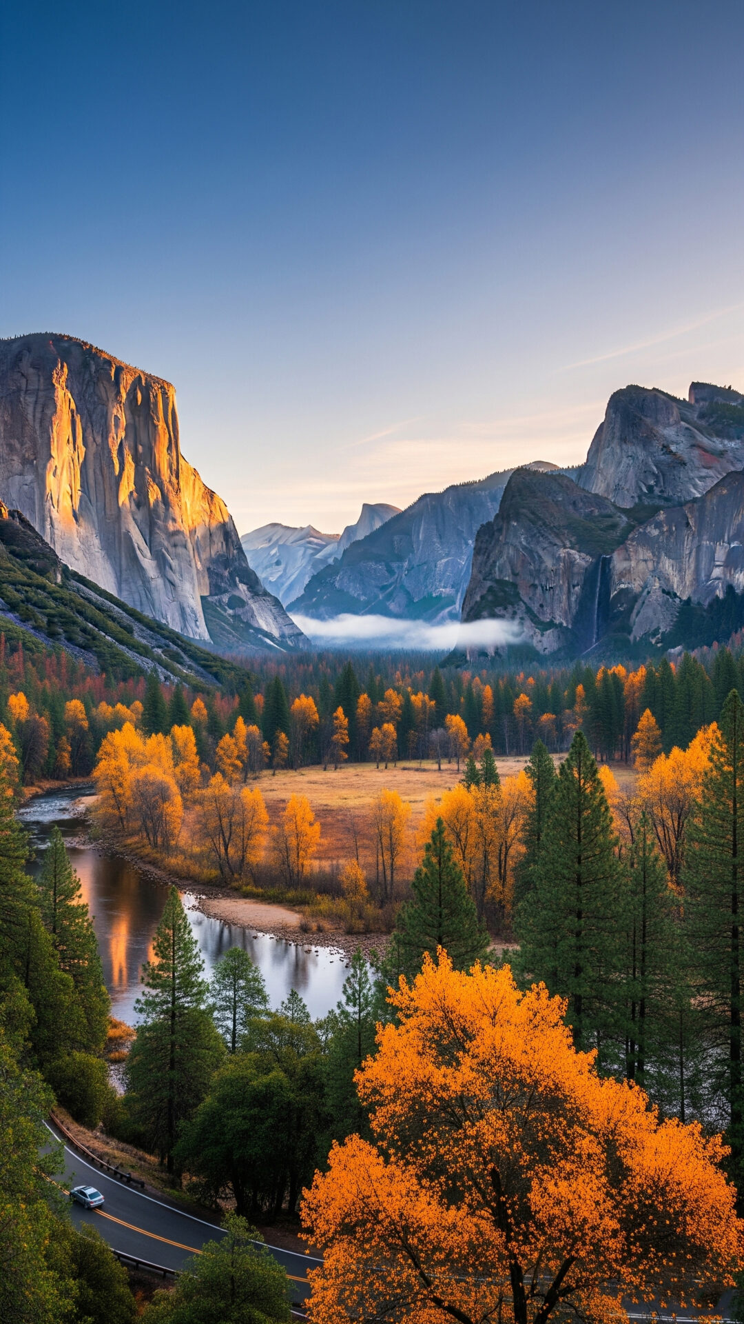 A river winds through a forested valley dominated by large granite cliffs under a blue sky. Warm golden light illuminates the autumn foliage…