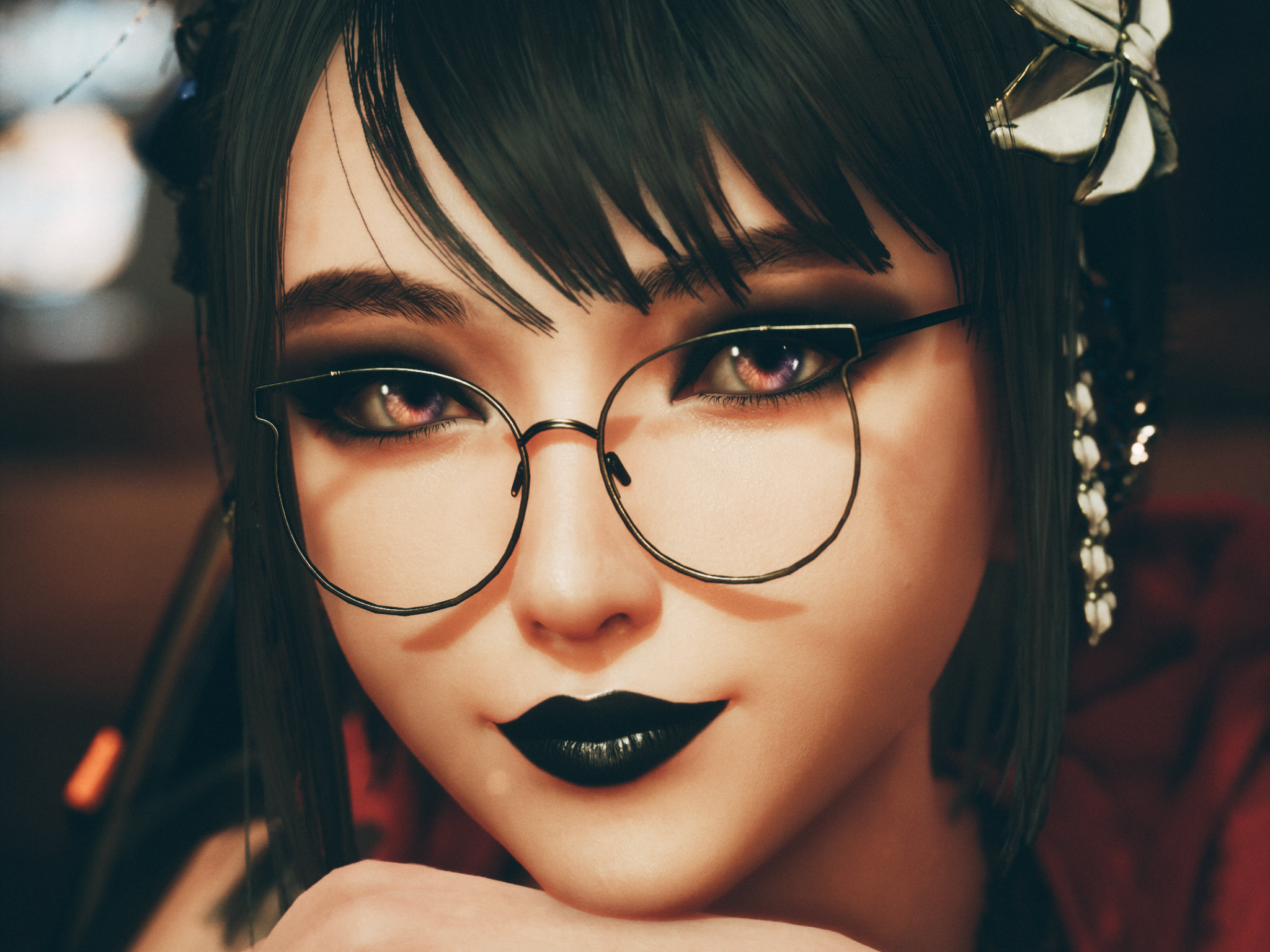 A young woman with dark hair and bangs, wearing round glasses and a red top, rests her chin on her hand. The background is out of focus but appears to be a room with lights and a wall.
